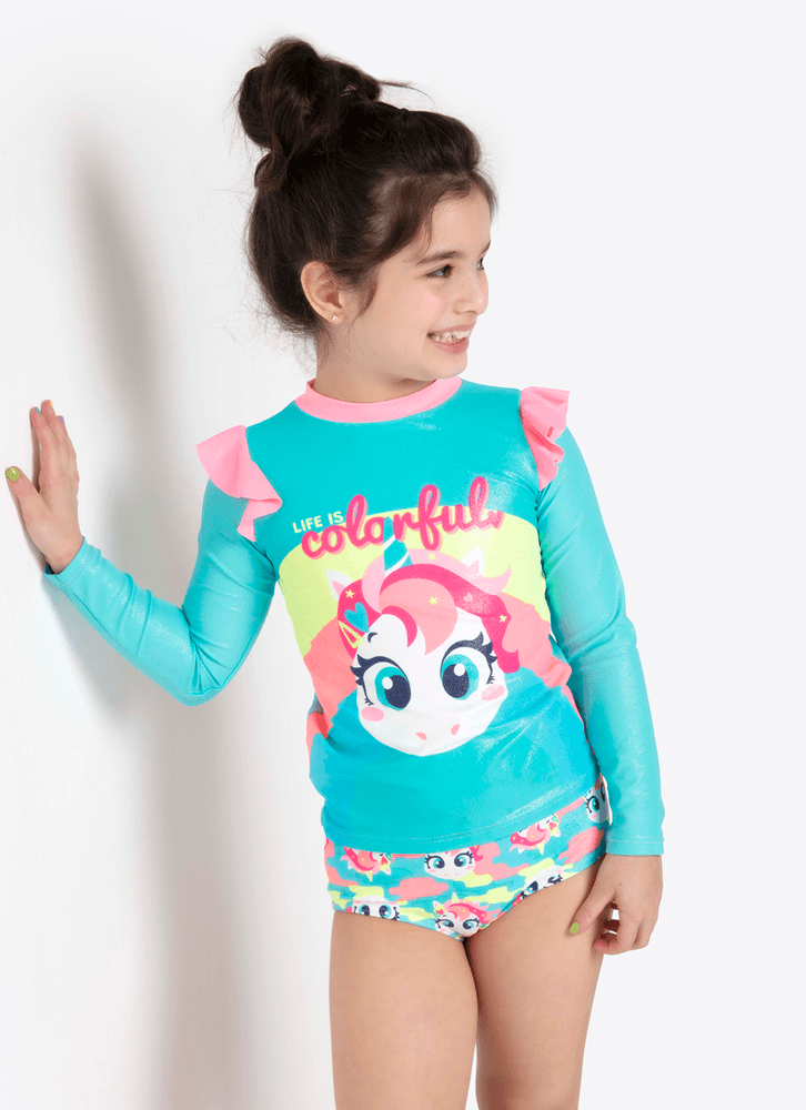 Camiseta Praia com Proteção Solar Menina Unicórnio Colorful