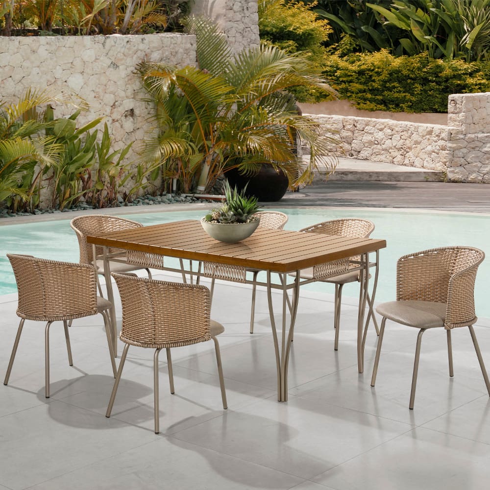 Mesa de Jantar Retangular Aço Nobre Roma com Tampo Ripado e 6 Cadeiras Estofadas Revestidas em Junco Sintético - Champanhe