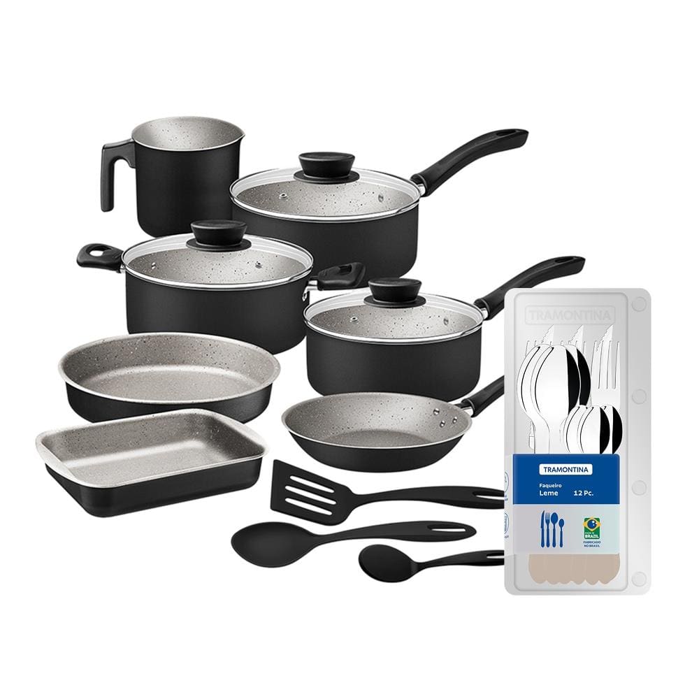 Conjunto de Panelas 10 Peças Tramontina Linz Starflon Max Preto + Faqueiro 12 Peças Tramontina Leme Cinza