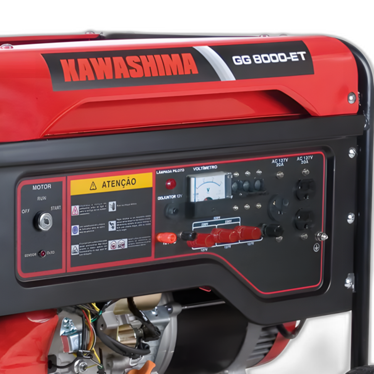 Gerador Gasolina Kawashima GG 8000-ET Trifásico: Potência Confiável 8.0 kW para Sua NecessidadeGaranta a continuidade de energia com o Gerador a Gasolina Kawashima GG 8000-ET, a solução robusta e confiável para suas demandas energéticas. Ideal para residências que buscam segurança contra quedas de luz, para o comércio que não pode parar, e para o campo ou canteiros de obra que exigem força e durabilidade. Este gerador trifásico de 8.0 kW de potência máxima oferece a tranquilidade de ter energia estável sempre que precisar. Equipado com um motor Kawashima GE 1500-E de 420 cc, ele entrega desempenho superior e uma vida útil prolongada. Sua potência nominal de 6500 W (8,13 kVA) e potência máxima de 7100 W (8,88 kVA) são perfeitas para alimentar equipamentos diversos, desde ferramentas elétricas até sistemas de iluminação e máquinas mais exigentes, operando em tensão de 220 V. O sistema de Regulador de Tensão Automático (AVR) integrado é um diferencial crucial, protegendo seus equipamentos eletrônicos de flutuações e picos de energia, garantindo uma alimentação mais limpa e segura. Com partida elétrica (12V - 17A) para maior comodidade e também partida manual como opção de backup, o GG 8000-ET Kawashima é sinônimo de versatilidade e facilidade de uso. Sua autonomia é reforçada por um tanque de combustível de 24 litros, minimizando a necessidade de reabastecimentos frequentes. Escolha a eficiência e a confiança de um gerador a gasolina projetado para as mais variadas aplicações.Especificações Modelo: GG 8000-ET Tipo: Gerador a gasolina, trifásico Motor: Kawashima GE 1500-E Tipo do motor: Monocilíndrico, horizontal, gasolina, 4T, refrigerado a ar Cilindradas: 420 cc Potência máxima do motor: 15 HP Tensão: 220 V Frequência: 60 Hz Potência máxima: 7100 W / 8,88 kVA Potência nominal: 6500 W / 8,13 kVA Capacidade do tanque de combustível: 24 L Consumo de combustível: 374 g/kWh Sistema de partida: Elétrico (12V - 17A) e manual Regulador de tensão (AVR): Sim Carregador de bateria: Sim Voltímetro: Sim Nível de ruído: 74 dB (A) Peso líquido: 87 kg Peso bruto: 90 kg Dimensões: 683 x 510 x 542 mm Dimensões da embalagem: 710 x 545 x 575 mm Dimensões do suporte da bateria: 70 x 180 mmItens Inclusos Gerador a Gasolina Kawashima GG 8000-ET Manual de instruçõesPerguntas Frequentes (FAQ) Pergunta: Qual a potência máxima e nominal deste gerador?Resposta: A potência máxima é de 7100 W (8,88 kVA) e a potência nominal é de 6500 W (8,13 kVA). Pergunta: Este gerador é trifásico e qual a voltagem de saída?Resposta: Sim, é um gerador trifásico com saída de tensão de 220 V. Pergunta: A bateria para a partida elétrica vem inclusa no equipamento?Resposta: Não, a bateria para a partida elétrica não acompanha o equipamento e deve ser adquirida separadamente. Pergunta: O gerador possui proteção para equipamentos eletrônicos?Resposta: Sim, ele vem com Regulador de Tensão (AVR) integrado, que ajuda a estabilizar a voltagem e proteger seus aparelhos. Pergunta: Qual a autonomia aproximada do gerador com um tanque cheio?Resposta: Com um tanque de 24 litros e consumo de 374 g/kWh, a autonomia varia conforme a carga aplicada.