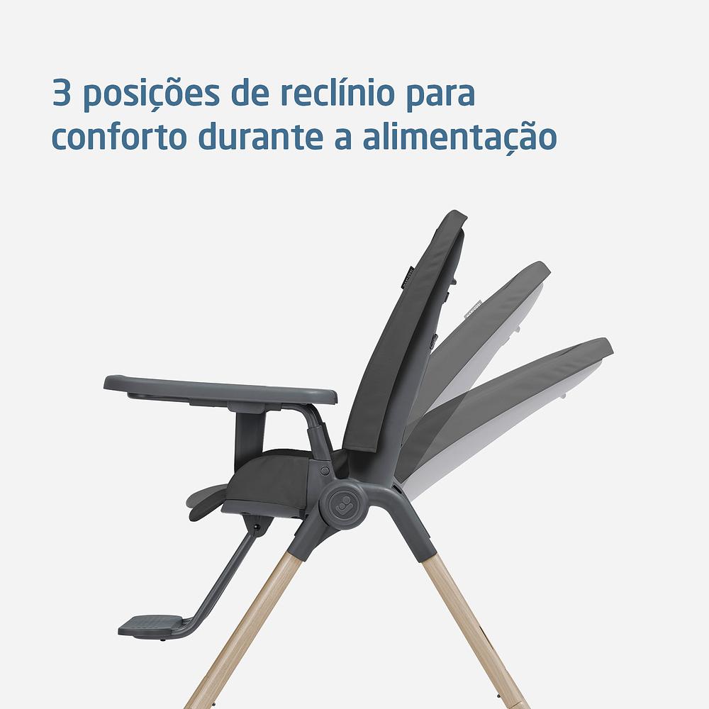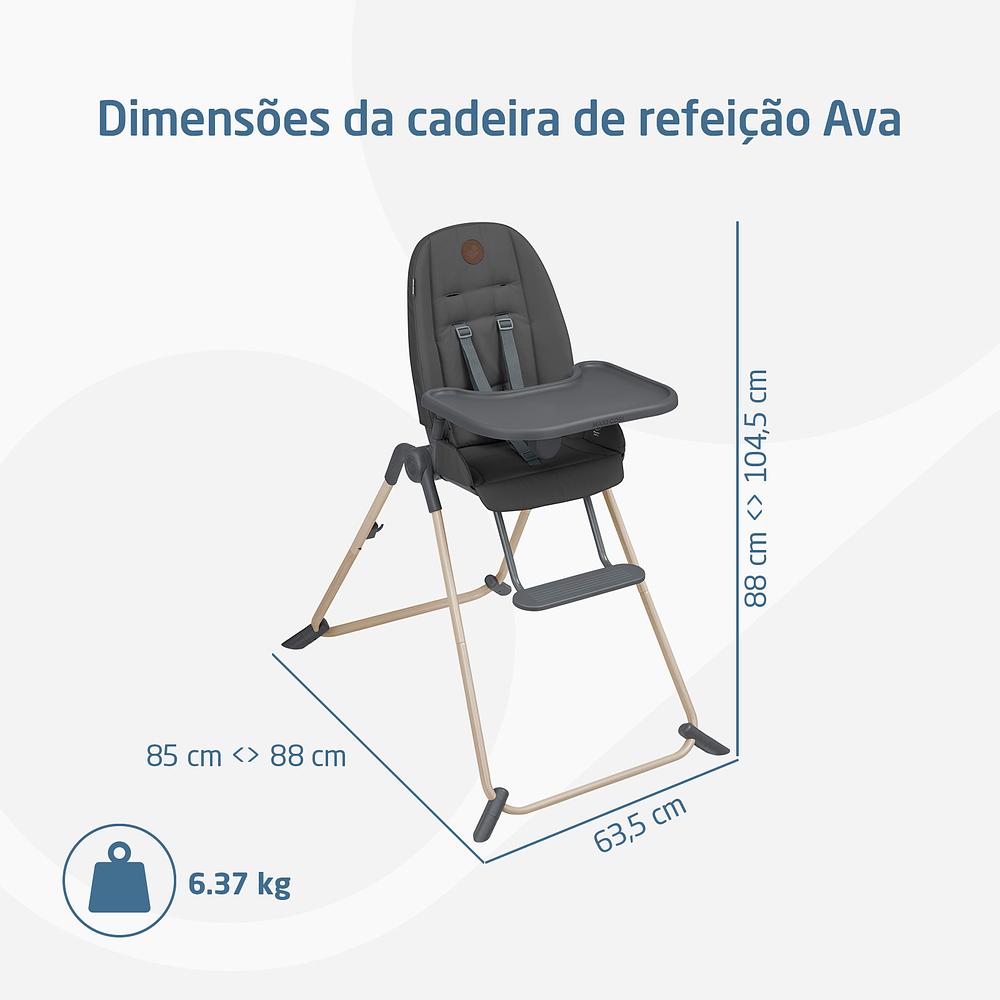 Cadeirinha de Alimentação Ava - Maxi-CosiA Cadeirinha Ava acompanha o crescimento do bebê, oferecendo conforto, segurança e praticidade desde os primeiros meses até os 3 anos. Compacta, leve e sustentável, é perfeita para famílias que buscam funcionalidade e facilidade no dia a dia.Nos primeiros meses, a Ava funciona como cadeira reclinada para descanso. Depois, acompanha a introdução alimentar e as refeições diárias até 15 kg. Seu design dobrável e leve, aliado a tecidos 100% reciclados e laváveis na máquina, garante praticidade, sustentabilidade e conforto em cada refeição.Características:• Três níveis de reclínio, do descanso à alimentação• Bandeja ajustável em várias posições, acompanha o crescimento do bebê• Estrutura dobrável e compacta, ideal para espaços pequenos• Tecido 100% reciclado, macio e lavável na máquina• Leve: apenas 6,37 kg, com alça integrada para transporte• Compacta e prática, perfeita para ambientes internos e viagensEspecificações Técnicas:• Indicação: 0 meses até 15 kg• Peso do produto: 6,37 kg• Dimensões: 104,5 x 63,5 x 88 cm (A x L x P)• Material: Aço, PP, PA, POM, TPE, Poliéster, PU• Garantia do fornecedor: 12 mesesA Cadeirinha Ava Beyond Graphite transforma cada refeição em um momento seguro, confortável e cheio de praticidade.