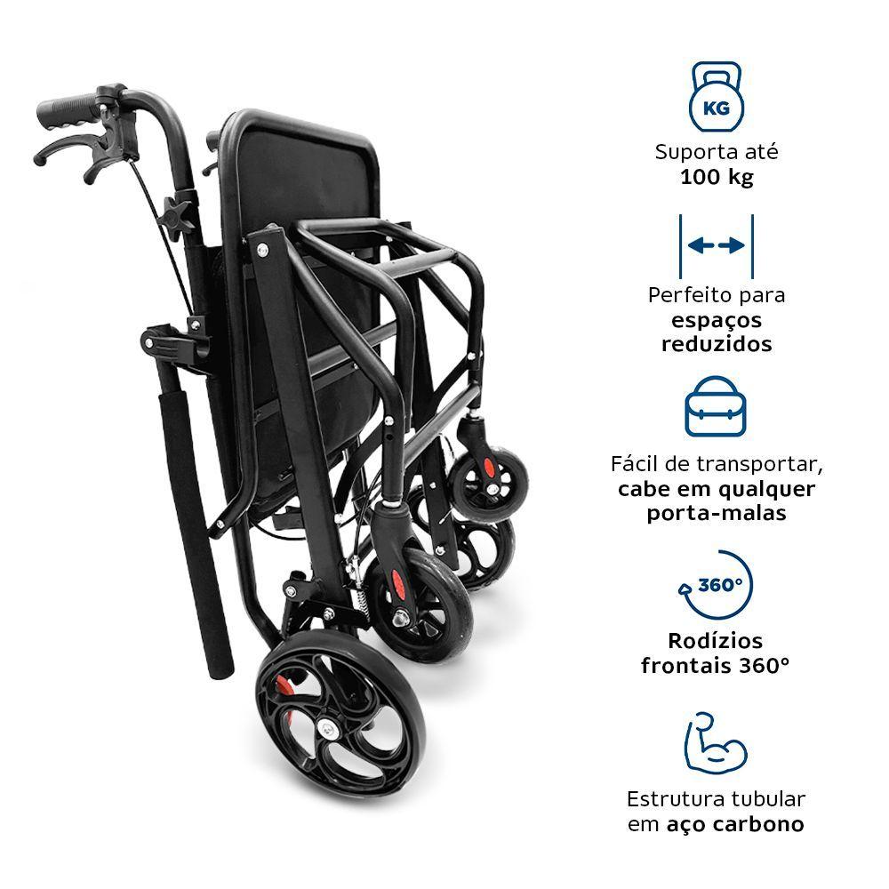 Cadeira de Transporte Dellamed em Aço Dobrável até 100kg D90 – Conforto, segurança e praticidade em cada detalheA Cadeira de Transporte Dellamed D90 foi desenvolvida para oferecer praticidade e conforto em deslocamentos rápidos e diários. Com estrutura em aço carbono e acabamento com pintura epóxi, é resistente e durável, suportando até 100 kg.Seu design dobrável e sistema de fechamento frontal tornam o transporte e o armazenamento mais fáceis, ocupando menos espaço. O encosto em nylon garante leveza e ventilação, enquanto os apoios de braços rebatíveis e acolchoados aumentam o conforto do usuário.Equipada com rodas dianteiras de 6” e traseiras de 8” em PVC, proporciona estabilidade e movimentação suave em ambientes internos e externos. Os freios de dupla ação, com função de trava e pressão manual, asseguram total segurança durante o uso.A Cadeira de Transporte Dellamed D90 é ideal para quem busca autonomia, conforto e praticidade, sendo perfeita para uso residencial, hospitalar ou em viagens curtas.Especificações técnicasMarca: DellamedModelo: D90Referência: 06955Cor: PretoTipo de cadeira: Cadeira de transporte manualMaterial: Estrutura em AçoCapacidade de peso: 100KgIndicação de uso: Uso diário / Residencial / Mobilidade reduzidaPeso da cadeira: 10KgLargura total: 52,5cmLargura do assento: 42 cmAltura do encosto: 42 cmAltura do apoio de braço ao chão: 71,5 cmRodas dianteiras e traseiras: Dianteiras 6” / Traseiras 8” em PVCApoio de braços: Rebatíveis e revestidos com espumaApoio de pés: RebatívelEncosto: Fixo em nylonSistema de fechamento: Fechamento frontalFreios: Freios de dupla ação, função de trava ou pressão manualEstofamento: NylonCinto de segurança: SimEstrutura: DobrávelAcabamento: Aço carbono, com pintura epóxiCertificações: ANVISA - 80795950042Dimensoes do produto: 52,5 L x 92 A x 69 P cmDimesnoes da embalagem: 24,5 L x 74 A x 54 P cmPeso: 10kgPeso Embalado: 12kgGarantia: 12 meses para peças em aço e 3 meses para demais componentes