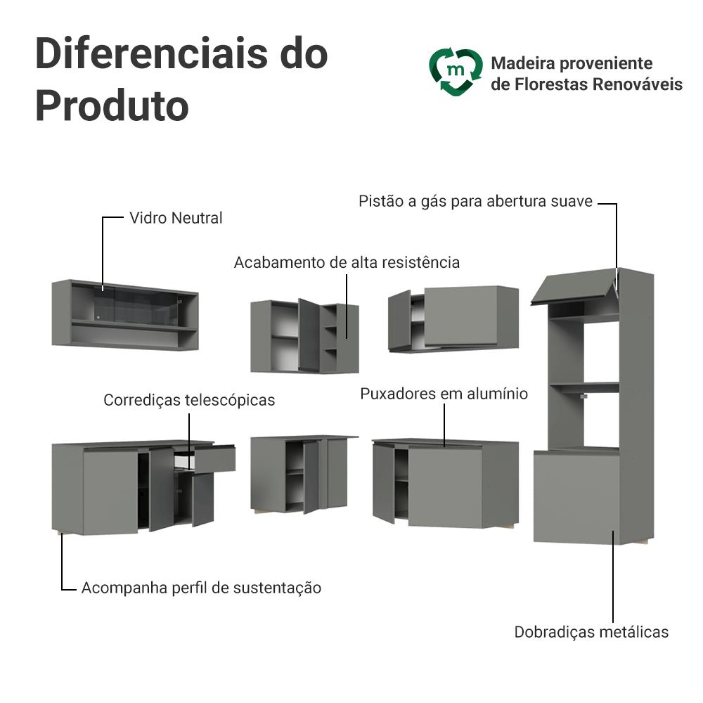 A Cozinha Nice combina um visual moderno e características que facilitam o uso no dia a dia.A linha Nice se diferencia por ser suspensa, acompanhando ferragens para fixação. O acabamento de alta resistência em cinza e os puxadores em alumínio reforçam o visual moderno, enquanto as corrediças proporcionam abertura total das gavetas. Os balcões acompanham tampo, garantindo praticidade.O destaque fica por conta do armário aéreo com porta de vidro neutral, adega integrada e torre quente com espaço dedicado para forno ou micro-ondas.Medidas totais:- 211 cm de altura- 445 cm de largura- 52 cm de profundidade nos balcões e torre quente e 31 cm nos aéreosInformações técnicas:- Material: MDP- Peso total suportado: 283 kgO que você recebe:- Uma Torre Quente de 60cm- Um Aéreo de 120cm- Dois Balcões de 120cm- Um Aéreo de Canto com adega acoplada- Um Balcão de Canto- Um aéreo de 120cm com vidro pontilhadoCódigo do produto: GCNC4450043BÉ importante saber:- Imagens meramente ilustrativas, a decoração não acompanha o produto- A Madesa não disponibiliza serviço de montagem- O produto segue com manual de instalação e todas as ferragens necessárias para sua montagemA Madesa possui compromisso com a sustentabilidade. Geramos energia limpa em nossa própria usina, priorizamos fornecedores responsáveis e utilizamos plástico reciclado em nossa produção. Além disso, reinserimos sobras no ciclo de reciclagem e investimos no desenvolvimento de nossos colaboradores e da comunidade.Garantia: Este produto conta com 1 ano de garantia total, sendo 3 meses de garantia legal e 9 meses de garantia contratual. A garantia cobre exclusivamente defeitos de fabricação e vícios ocultos. Não estão cobertos: problemas decorrentes de montagem incorreta, uso inadequado, exposição à umidade, calor ou luz solar direta, modificações no produto ou desgaste natural.