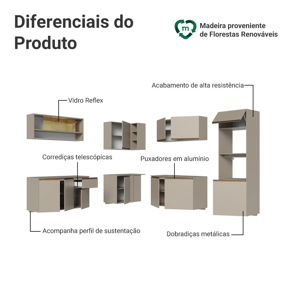 A Cozinha Nice combina um visual moderno e características que facilitam o uso no dia a dia.A linha Nice se diferencia por ser suspensa, acompanhando ferragens para fixação. O acabamento de alta resistência no tom crema e os puxadores em bronze metalizado reforçam o visual elegante, enquanto as corrediças proporcionam abertura total das gavetas. Os balcões acompanham tampo, garantindo praticidade.O destaque fica por conta do armário aéreo com porta de vidro reflex, adega integrada e torre quente com espaço dedicado para forno ou micro-ondas.Medidas totais:- 211 cm de altura- 445 cm de largura- 52 cm de profundidade nos balcões e torre quente e 31 cm nos aéreosInformações técnicas:- Material: MDP- Peso total suportado: 283 kgO que você recebe:- Uma Torre Quente de 60cm- Um Aéreo de 120cm- Dois Balcões de 120cm- Um Aéreo de Canto com adega acoplada- Um Balcão de Canto- Um aéreo de 120cm com vidro pontilhadoCódigo do produto: GCNC4450047PÉ importante saber:- Imagens meramente ilustrativas, a decoração não acompanha o produto- A Madesa não disponibiliza serviço de montagem- O produto segue com manual de instalação e todas as ferragens necessárias para sua montagemA Madesa possui compromisso com a sustentabilidade. Geramos energia limpa em nossa própria usina, priorizamos fornecedores responsáveis e utilizamos plástico reciclado em nossa produção. Além disso, reinserimos sobras no ciclo de reciclagem e investimos no desenvolvimento de nossos colaboradores e da comunidade.Garantia: Este produto conta com 1 ano de garantia total, sendo 3 meses de garantia legal e 9 meses de garantia contratual. A garantia cobre exclusivamente defeitos de fabricação e vícios ocultos. Não estão cobertos: problemas decorrentes de montagem incorreta, uso inadequado, exposição à umidade, calor ou luz solar direta, modificações no produto ou desgaste natural.