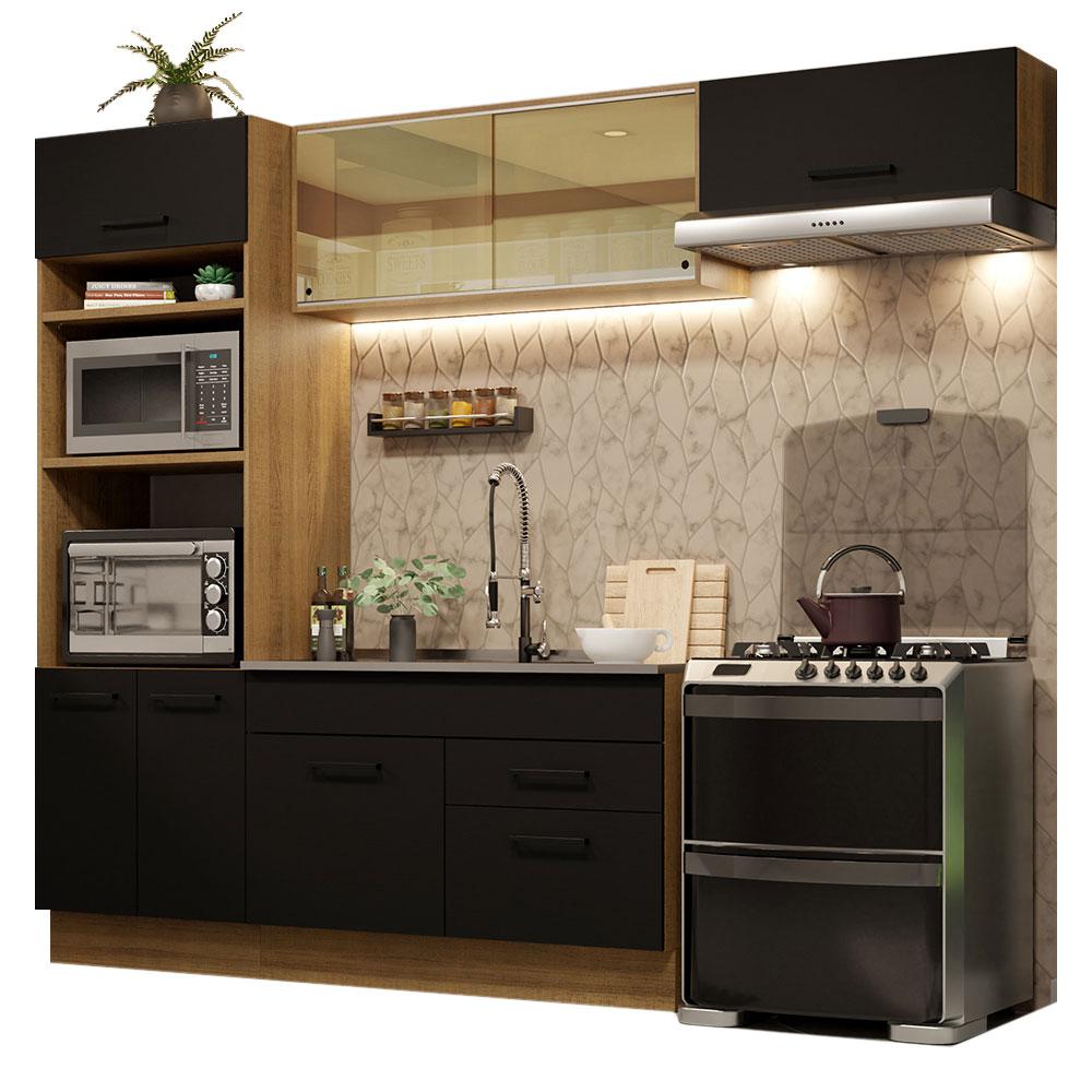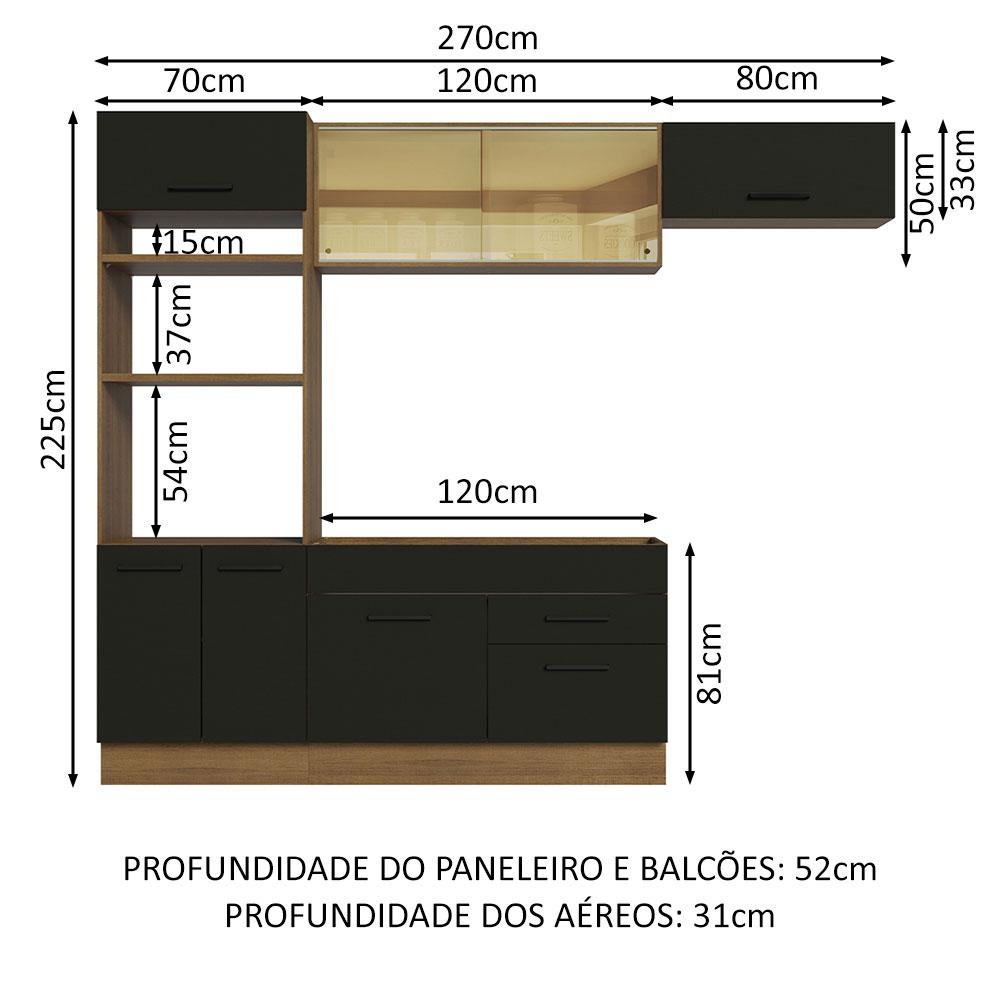 Procurando por uma cozinha bonita, moderna e funcional? Então confira esta versão completa da linha Agata da Madesa.Fabricada com alto padrão de qualidade, possui puxadores com alça em alumínio, gavetas com corrediças telescópicas de abertura total, vidros reflex no aéreo e as portas com amortecimento para fechamento suave.Se destaca pelo ótimo espaço disponível, perfeito para fazer a organização de toda a parte de louças, eletroportáteis, utensílios e muito mais. A torre quente ainda oferece espaço para forno e micro-ondas e é possível instalar forno embutido.Por ser uma cozinha planejada, conta com armários e balcões são avulsos, o que permite que você organize as peças conforme a necessidade do seu espaço.E se você deseja fazer a instalação de pia, o balcão desta cozinha oferece espaço de 120 x 52 cm e suporta pias de inox ou pedra.Para completar, os pés em PVC com ajuste de altura e rodapé removível em MDP de encaixe fácil, para facilitar na hora da limpeza.O acabamento da estrutura é em amadeirado Rustic e o das portas e frentes é preto. As partes internas das costas e das gavetas são brancas. É feito em Pintura Poliéster ecológica com sete camadas que protegem o móvel dos efeitos da água e do calor.Esta cozinha pode ser complementada pelos módulos avulsos da linha Agata da Madesa.Medidas totais:- 225 cm de altura- 270 cm de largura- 52 cm de profundidade nos módulos inferiores e 31 cm nos aéreosItens inclusos:- Uma (1) Torre Quente de 70 cm com três (3) portas e dois (2) nichos- Um (1) Aéreo de 120 cm com duas (2) portas de correr de vidro reflex- Um (1) Balcão de Pia com duas (2) gavetas e uma (1) porta- Um (1) Aéreo de 80 cm com uma (1) porta basculanteCódigo do produto: GRAG2700047KObs.:- As imagens são meramente ilustrativas, os eletros e a decoração não acompanham o produto- A Madesa não disponibiliza serviço de montagem- O produto segue com manual e todas as ferragens necessárias para a instalação- Por segurança, é obrigatório fixar a torre na parede1 – O produto é novo ou usado?R.: Todos os produtos da Madesa são novos, enviados da nossa fábrica diretamente para as casas de nossos clientes.2 – O produto vem montado? Se não, vocês realizam a montagem?R.: A Madesa não disponibiliza serviço de montagem. Todos os produtos seguem com manual de instalação e as ferragens necessárias. Alguns produtos possuem vídeo explicando o passo a passo da montagem.3 – Vocês possuem loja física? Posso retirar meu produto em mãos?R.: Não possuímos loja física, apenas loja virtual. Confira as opções de envio ao colocar o seu CEP.4 – Qual é o valor do envio? Posso pagar separadamente?R.: O valor do envio é calculado com base no peso e volume do produto, e no CEP de destino. Você pode calcular o valor e prazo de entrega no simulador.5 – A Madesa entrega em todo Brasil? Como é feita a entrega?R.: Sim, entregamos no Brasil inteiro através de transportadoras parceiras.A Madesa se dedica à sustentabilidade com várias iniciativas: temos uma usina própria para gerar energia que abastece uma de nossas fábricas. Selecionamos nossos fornecedores, priorizando aqueles que possuem um compromisso com a sustentabilidade e proteção do meio ambiente. Todo o plástico utilizado no setor produtivo é proveniente de reciclagem e as suas sobras são encaminhadas ao fornecedor que os recicla. Também investimos no desenvolvimento contínuo de nossos colaboradores e em ações educacionais que beneficiem a comunidade.