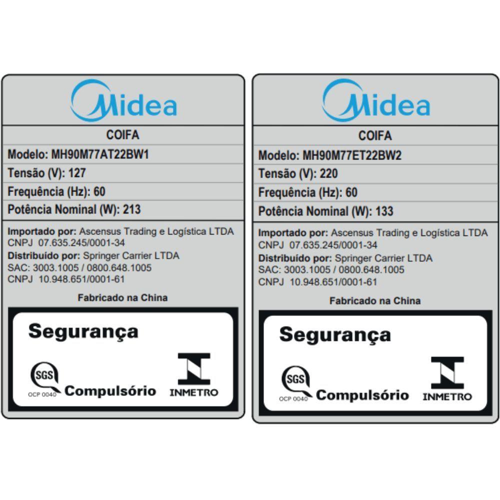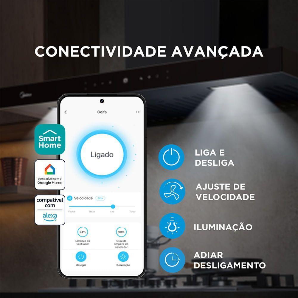 Coifa De Parede 90cm Black Inox Smart Pro Touch Midea MH90M77AT22BW1 110VA Coifa de Parede Black Inox Midea é a escolha perfeita para quem busca sofisticação, praticidade e alta performance na cozinha. Com design moderno em T-Shape, é confeccionada com materiais de alto padrão, possui acabamento em inox preto que acrescenta um toque de sofisticação e elegância ao ambiente, além de vir com diversas funções que proporcionam inúmeras facilidades. A função Smoke Sensor detecta a intensidade da fumaça e ajusta automaticamente a potência da coifa, fazendo a sucção adequada e eliminando a necessidade de ajustes manuais. Já o Gesture Sensor permite controlar diversas funções com um simples movimento da mão, sem precisar tocar no painel de vidro. A Smart Pro Touch Midea também é conectada, funciona via aplicativo SmartHome e por comando de voz (Alexa e Google Assistant). Com essas funcionalidades, você pode ligar a coifa à distância, alterar as velocidades, acionar e programar o Air Refresh para recircular o ar de sua cozinha (mantendo-o sempre limpo), além de saber a hora certa de limpar o filtro Baffle. Transforme seu dia a dia na cozinha em uma experiência ainda mais agradável.ATENÇÃO: ESTA LOJA NÃO FATURA PARA CNPJ.Conectividade Avançada: Controle por comando de voz via Alexa ou Google Assistant. Acesse diversas funções pelo app SmartHome.Smoke Sensor: Sensores com Inteligência Artificial que identificam o nível de fumaça do cozimento e ajustam automaticamente a velocidade de sucção.Gesture Sensor: Mãos sujas ao cozinhar? Ligue, desligue e altere a velocidade de sucção da coifa por meio de gestos.Especificações Técnicas:Marca: MideaCódigo do Produto: MH90M77AT22BW1.MH90M77AT22BW2Tipo de Coifa: De ParedeCor: Black InoxTipo de coifa: Coifa de ParedeProduto conectado: SimInteligência Artificial: SimMaterial: Inox Preto e VidroNíveis de Velocidade de Sucção: 550Lâmpadas: Sim (x2) em LEDChaminés: 2Filtro de Carvão Ativado: Sim (x2)Filtro de Alumínio: NãoFunção Depurador: SimFunção Exaustor: SimFrequência (Hz): 60HzFreqüência de operação da coifa: 60HzNível de Ruído (127v): 67Nível de Ruído (220): 67Origem: ImportadoProduto Altura (cm): Com 1 Chaminé: 45cm, com 2 Chaminé 82cm e sem Chaminé 33cmProduto Profundidade (cm): 50,5 cmProduto Largura (cm): 89,8 cmProduto Peso (kg): 13,8kgConteúdo HTML:Produto Embalado Altura (cm): 65cmProduto Embalado Peso (kg): 17,5kgProduto Embalado Largura (cm): 98cmProduto Embalado Profundidade (cm): 38,5cmItens inclusos na embalagem: Coifa, Manual do Usuário, 2x Filtro de Carvão, 3x Filtro Baffle , 1x chaminé superior, 1x chaminé inferior, 1 x Duto de exaustão.Garantia do Produto: 12 meses