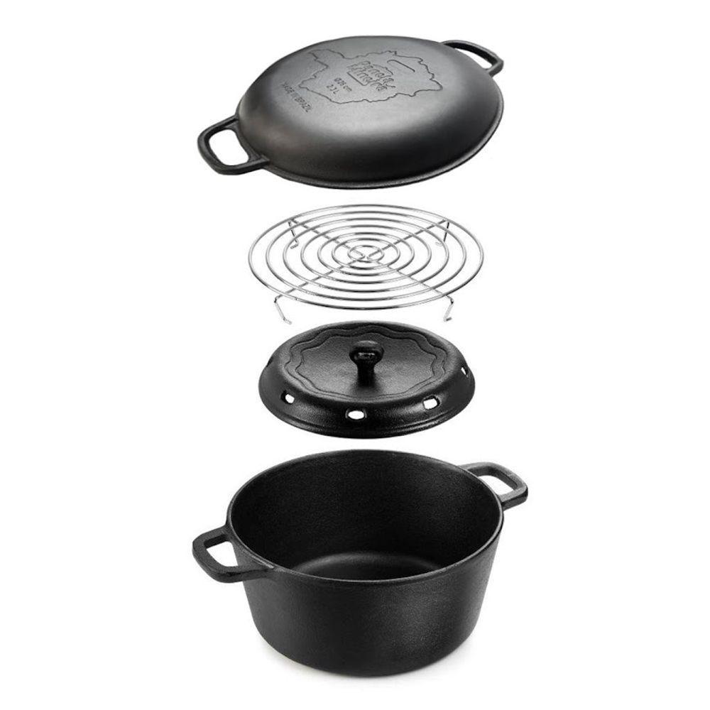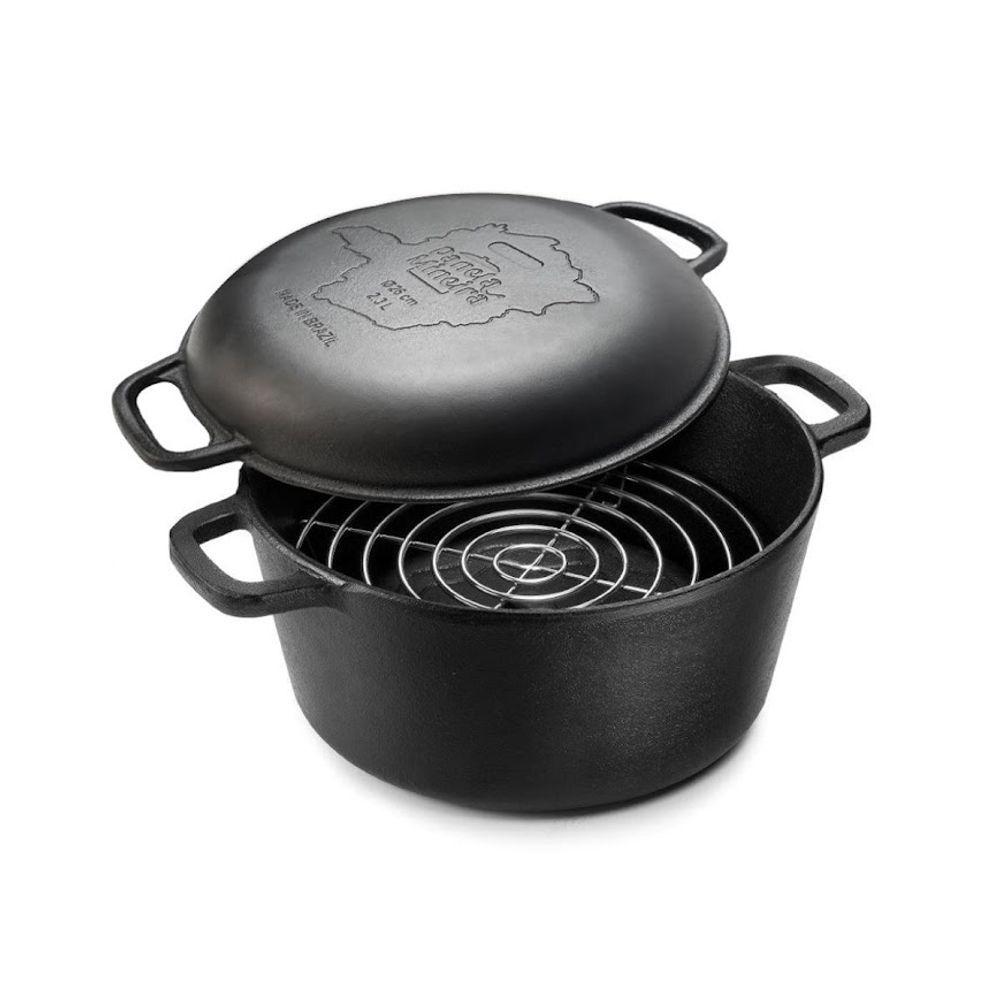 Panela Defumação Mg Ferro Fundido Panelamineira 28x16cm 8,2lPanela Defumação MG Ferro Fundido PanelaMineira 28x16cm 8,2LA Panela de Defumação da Panela Mineira é uma peça única. Apresenta um design aprimorado, com um fundo preto reto, bordas alongadas e tampa, que garantem uma cocção prolongada uniforme, com excelente distribuição de calor, a tornando ideal para o preparo de pães, bolos, carnes, arroz, bifes, frangos, peixes, vegetais e muito mais. Acompanha grelha, placa de defumação e tampa moderna. Pode ser utilizado como assadeira, caçarola e frigideira. A tampa é timbrada com a bandeira de Minas Gerais.Onde usar: Ideal para uso em fogões a gás, lenha, elétricos, cooktop de indução e fornos. Muito utilizada em redes de hotelaria, cozinhas industriais e gourmets.Orientação de Uso e Conservação:Antes do primeiro uso: Lave com água e sabão, seque bem com um pano e leve ao fogo para remover toda a umidade. Já vem pronta para uso, então não precisa ser curada. Guarde em um local seco.Após cada uso: Lave com água e sabão, usando uma esponja ou escova para remover todos os resíduos de alimentos. Se restarem resíduos, ferva água com um pouco de detergente para soltá-los.Pintura: Revestimento atóxico que garante durabilidade e proteção prolongada, sem causar nenhum dano à saúde.Características Técnicas e Medidas:Altura com Tampa: 16,5cm.Altura sem Tampa: 11,5cm.Material: Ferro Fundido.Litragem Caçarola: 7,4L.Litragem Tampa: 0,8L.Alças: Alça de Ferro.Modelo: Redondo.Diâmetro: 28cm.Peso: 8,78Kg.Linha: CHEF.Chapa: Lisa.Itens Inclusos:01 Tampa Frigideira em Ferro Fundido com Alças Ferro.01 Caçarola em Ferro Fundido com Alças em Ferro.01 Placa de Defumação.01 Grelha.Código: 6446PM