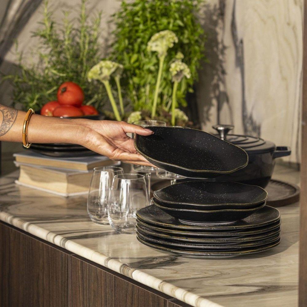 Aparelho De Jantar 30 Peças Ryo Volcano OxfordAparelho de Jantar 30 Peças Ryo Volcano OxfordO orgânico shape Ryo, valoriza a fluidez e a beleza do imperfeito, assim como propõe a filosofia japonesa Wabi-sabi. Dialogando com tendências que buscam a conexão com a natureza, as novas decorações da linha celebram a dualidade dos elementos de fogo e água. Com acabamento acetinado, a decoração Volcano captura a essência das chamas e da transição do fogo em brasa com o imponente preto fosco. As bordas orgânicas recebem um filete reagente de tonalidade ocre. O aparelho de jantar 30 peças atende uma mesa posta completa para 6 pessoas com pratos rasos, fundos, sobremesa, xícaras e pires.Aparelho de Jantar 30 peças Ryo Volcano Oxford - Incluso6 Pratos Rasos - 27,5 cm6 Pratos Fundos - 21 cm6 Pratos Sobremesa - 21,5 cm6 Pires de Chá - 16 cm6 Xícaras de Chá - 200 mlAparelho de Jantar 30 peças Ryo Volcano Oxford - InformaçõesUso: Resistente a micro-ondas, resistente a lava-louçasMaterial: PorcelanaFormato: OrgânicoDecoração: VolcanoCor: Preto e marrom