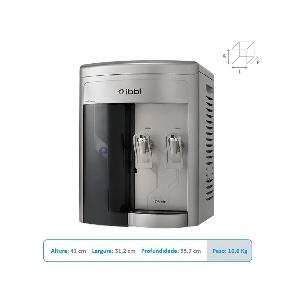 Purificador De água IBBL FR600 Speciale Prata 110VPurificador De Água IBBL FR600 Speciale PrataSó o FR600 Speciale tem a capacidade de uso que você precisa. Ele atende uma grande quantidade de pessoas e apresenta baixo custo de energia. Possui Refil ‘‘Girou, Trocou’’, nanotecnologia contra micro-organismos.Pressão por gravidadeDesign robusto com tecnologia de pressão de água por gravidade. Proporciona um jato espesso e uniforme para encher copos, jarras ou garrafas em poucos segundos, independentemente da pressão hidráulica da casa.Refrigeração por compressorCom eficiente sistema de refrigeração por compressor, garante água gelada para famílias e ambientes com alta circulação de pessoas.Sua água mais pura e segura!- Retém impurezas contaminantes;- Remove cloro livre;- Controla a proliferação de bactérias;- Elimina sabores e odores.Especificações Técnicas:Marca: IBBLModelo: FR600 SpecialeCor: PrataTensão: 127VPotência: 90WTemperatura da Água: Natural e GeladaTipo: Residencial/ComercialIdeal para até: 20 pessoasTipo de Refrigeração: CompressorConsumo (Kwh/mês): 11Eficiência Energética (kWh/l): 0,07Capacidade de Fornecimento de água Gelada (l/h): 1,24Dimensões e Peso:Altura: 41cmLargura: 31,2cmProfundidade: 35,7cmGarantia01 Ano (Sendo 3 meses de garantia legal e mais 9 meses de garantia para defeito de fabricação)