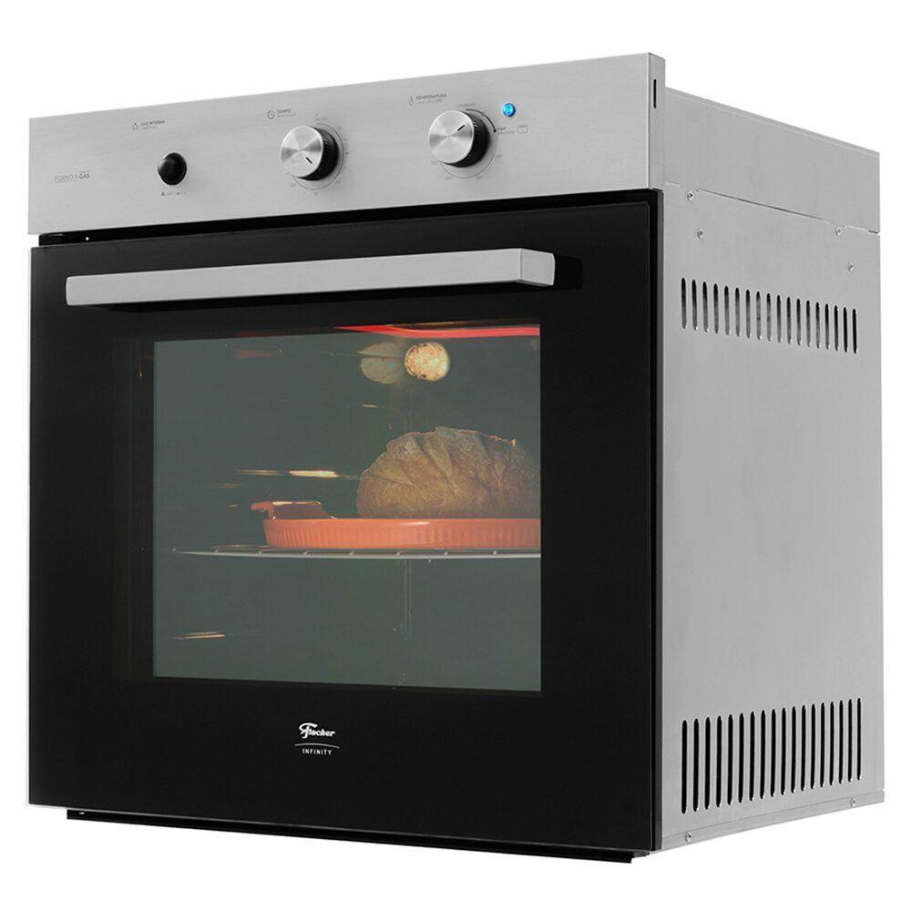 Forno A Gás De Embutir 78L Fischer Infinity Com Grill Inox Inox 220VO Forno a Gas de Embutir 78 Litros Fischer Infinity com Grill Inox 36450 ajuda voce para preparar as suas refeicoes. Com um design moderno, ele harmoniza com todos os produtos da Linha Infinity e e ideal para os diversos preparos do dia a dia.Com 78 litros de capacidade o Forno a Gas de Embutir Fischer Infinity com Grill possui 3 niveis de altura que permitem a preparacao de uma ampla variedade de receitas. Conta com porta de vidro duplo que retem o calor no interior do forno, economizando energia e proporcionando seguranca.O ajuste de temperatura e preciso, variando de 160 a 260C, e conta com um timer com aviso sonoro de conclusao, o que torna o preparo das receitas muito mais pratico.Esse Forno a Gas de Embutir oferece diversas funcoes adicionais, como o grill, ideal para finalizar suas receitas, deixando-as mais crocantes e saborosas. Alem disso, possui luz interna que facilita a visualizacao dos assados.E o forno ideal para quem busca praticidade e seguranca. Conta com revestimento interno EasyClean, que nao absorve gordura e facilita a limpeza, alem de uma valvula corta gas que proporciona total seguranca ao utilizar o produto, garantindo tranquilidade no preparo das receitas.Caracteristicas:Marca: FischerModelo: InfinityTipo: A Gas e EmbutirCapacidade do forno: 78 litrosPainel: Aco inox escovadoPorta: Vidro duploGrade: Interna: Uma grade cromada, ajustavel com 3 niveis de alturaIluminacao interna: SimPotencia da lampada: 25 wattsTimer: com aviso sonoro de conclusaoGrill: SimSistema de seguranca corta gas: SimCertificacao Inmetro: Portaria 008Classificacao Energetica: AFrequencia: 60 HzCorrente: 110V: 6,7 A | 220V: 3,8 AConsumo de gas: 0,122 kg/hPressao do gas: GLP: 27,5 mbar = 2,75 kPa | GN: 20 mbar = 2,0 kPaRevestimento interno: Easy CleanCabo de alimentacao: 1 mConteudo da embalagem:Manual de instrucoesDimensoes:Altura: 60 cmLargura: 59,5 cmProfundidade: 62,3 cmPeso: 25 kgDimensoes interna do forno:Altura: 38,3 cmLargura: 44 cmProfundidade: 46 cmDimensoes do nicho:Altura: 59 cmLargura: 56 cmProfundidade: 57,5 cmGarantia do Fabricante: 12 meses