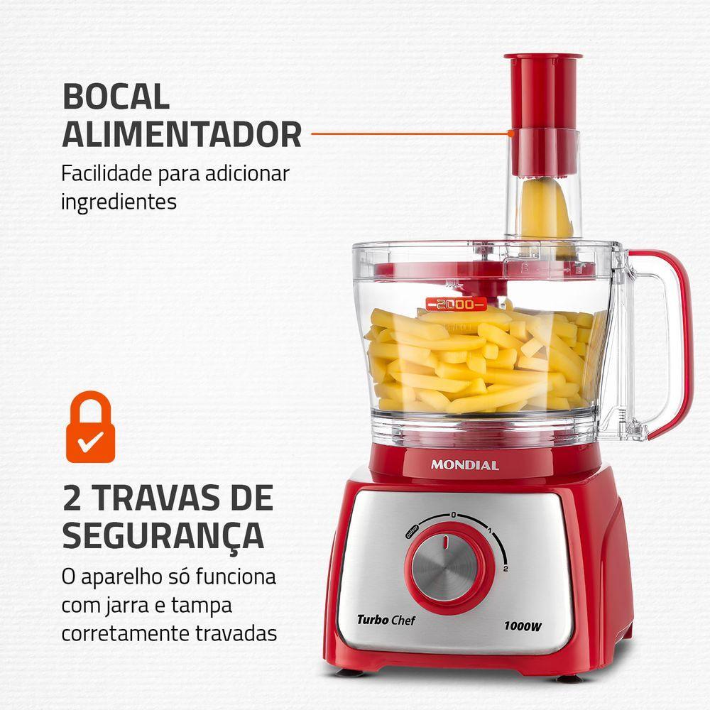Multiprocessador Turbo Chef 7 em 1 Mondial MPN-01-RE 220VO Multiprocessador modelo MPN-01-RE (7 em 1) da Mondial é uma combinação de processador, liquidificador e mais seis acessórios versáteis para processar, ralar, triturar, fatiar e picar alimentos. O motor, de 1000W de potência, proporciona um alto desempenho na hora de preparar suas receitas.Por falar em receitas, este produto permite múltiplas possibilidades e praticidade no seu dia a dia: fatiar batata chips ou salame rapidamente, fazer uma salada em minutos, processar grãos e temperos, além de sucos, vitaminas, caldos, massa de bolo, entre outros. Conheça todos os benefícios do Multiprocessador Mondial:PROCESSADOR 7 EM 1: LIQUIDIFICADOR + 6 ACESSÓRIOS: O processador de alimentos vem acompanhado da jarra liquidificador e mais 6 acessórios: lâmina picadora, fatiador, ralador, palitador, espremedor e filtro do liquidificador.1000W: A alta potência permite o preparo até de alimentos mais consistentes e massas pesadas. Você vai se surpreender com o resultado no preparo de suas receitas!JARRA DO PROCESSADOR DE 3,2 LITROS: A capacidade útil é de 2 litros. O item é ideal para processar carnes, queijos, vegetais, grãos, temperos, entre outros.JARRA DO LIQUIDIFICADOR DE 3 LITROS + FILTRO: A capacidade útil de 2,1 litros. O item é ideal para preparar sucos, vitaminas, caldos, molhos, bolos, entre outros.OS 6 ACESSÓRIOS:1. Filtro do Liquidificador: Sucos e molhos puros e coados.2. Lâmina picadora e batedora: Ideal para picar, cortar, misturar, moer, desfiar, esfarelar, fazer sobremesas, molhos e bater massas.3. Lâmina fatiadora: Fatia queijos, salames, legumes, frutas, entre outros.4. Lâmina raladora e granuladora: Rala cenoura, repolho, temperos, chocolate, entre outros.5. Lâmina Palitador: Corta batata, cenoura, pepino e outros vegetais em forma de palito.6. Espremedor de Frutas: acessório para preparar suco de laranja ou limão, com o máximo aproveitamento da fruta.BOCAL ALIMENTADOR: Proporciona mais facilidade para adicionar ingredientes e um processamento rápido e seguro.2 VELOCIDADES + FUNÇÃO TURBO: Permite controlar a intensidade de trituração do alimento de acordo com a textura que desejar, além de garantir o processamento mais rápido.PEÇAS REMOVÍVEIS: Basta desmontar as peças para lavar, o que garante uma facilidade maior na hora da limpeza.TRAVA DE SEGURANÇA + PÉS ANTIDERRAPANTES: O Aparelho só funciona com jarra e tampa corretamente encaixadas e travadas. Além disso, os pés antiderrapantes proporcionam maior estabilidade durante o uso. Maior segurança: check!BPA FREE: O material das jarras não contém Bisfenol-A (nocivo à saúde) e garante mais segurança para toda a família.ARMAZENAMENTO COMPACTO: Os acessórios podem ser colocados dentro do recipiente para obter um armazenamento fácil.Especificações Técnicas:- Modelo: MPN-01-RE- Cor: Vermelho- Voltagem (Tensão): 127V/220V- Potência: 1000W- Itens inclusos: 01 Multiprocessador; 01 Lâmina Picadora; 01 Lâmina Raladora; 01 Lâmina Palitadora; 01 Lâmina Fatiadora; 01 Espremedor; 01 Copo de 3,0L + Filtro e 01 Manual de Instruções.- Capacidade: 3L e 3,2L- Tipo de lâmina: Lâminas em aço inox- Comprimento do cabo: 1,50m- Desmontável: Sim- Velocidades: 2 + função turbo- Funções: Processa e mistura frutas, vegetais, queijos, carnes, castanhas, cocos, temperos e etc.- Guarda-fio: Sim- Tipo de tomada: 10A- Antiaderente: Não se aplica- Benefícios: Rala, pica, fatia, tritura e mistura com mais facilidade.- Alimentação: Energia Elétrica- Material: PP e Inox- Peso do produto: 3kg- Dimensões do produto: 24cm x 13cm x 17,5Cm (AxLxP)- Garantia: 1 Ano- Marca: Mondial