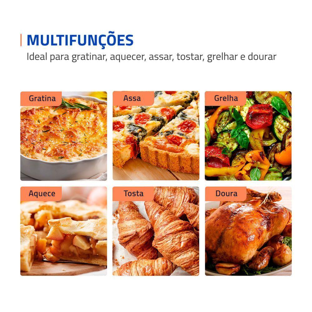 Forno Elétrico Mondial Family II Preto/Inox 1600W 42L FRN-42-B 220VForno Elétrico Mondial Family II 42L com Grelha - Preto/InoxO Forno Elétrico Mondial Family II é ideal para quem busca praticidade na cozinha. Com 42 litros de capacidade, ele permite preparar desde pequenas porções até pratos maiores com tranquilidade. Seus 1600W de potência aquecem, assam, gratinam e grelham os alimentos com eficiência, enquanto o timer e o controle de temperatura garantem o ponto perfeito para suas receitas.Principais Características:Grande Capacidade de 42 Litros: Com ótimo espaço interno, é ideal para o preparo de receitas para toda a família, de assados a pizzas e bolos.Multifunções com Seletor de Resistência: É versátil para aquecer, assar, tostar, gratinar e grelhar. O seletor com 3 opções permite distribuir melhor o calor, usando as resistências superior, inferior ou ambas.Timer de 90 Minutos com Desligamento Automático: Programe o tempo de preparo e realize outras tarefas sem preocupação. O forno desliga sozinho e emite um aviso sonoro ao final.Controle Preciso de Temperatura: O seletor de temperatura varia de 100°C a 250°C, permitindo que você ajuste a intensidade do calor de acordo com a receita que vai preparar.Design Moderno e Prático: Conta com puxador e botões em aço inox, porta de vidro para melhor visualização, luz interna e grelha com regulagem de altura em três níveis.Especificações Técnicas:Marca: MondialModelo: Family II FRN-42-BVoltagem: 220VTipo: Forno Elétrico de BancadaCapacidade: 42 LitrosPotência: 1600WConsumo: 1,6 kWhFaixa de Temperatura: 100°C a 250°CTimer: 90 minutosCor: Preto e InoxPeso: 5,99 kgDimensões [AxLxP]: 33,2 x 53 x 37,5 cmGarantia: 12 meses