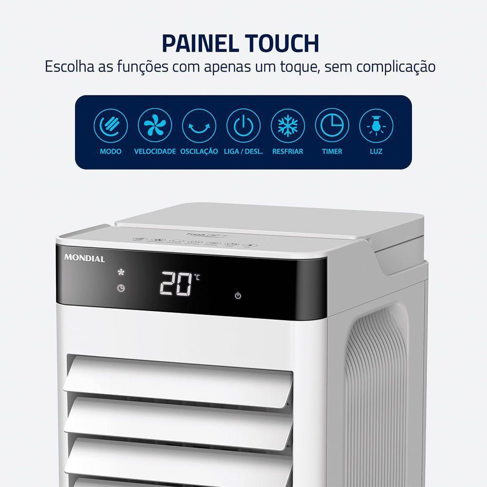 Climatizador Fresh Air Mondial Branco 90W CL-07L110VClimatizador de Ar Mondial Fresh Air 7 CL-07L – 7 Litros, com Controle Remoto e TimerDescrição do ProdutoMantenha sua casa sempre fresca e confortável com o Climatizador de Ar Mondial Fresh Air 7 (CL-07L). Com reservatório de 7 litros e indicador de nível de água, ele é ideal para o uso diário, proporcionando conforto térmico de forma prática e eficiente.O aparelho reúne 5 funções em 1 só produto: filtra, ventila, circula, umidifica e climatiza o ar, melhorando a qualidade do ambiente em todas as estações.O sistema de oscilação vertical automática e horizontal manual garante uma de ar uniforme. Com três velocidades de ventilação, além das funções resfriar e oscilar, você ajusta o fluxo conforme sua preferência — desde uma brisa leve até um resfriamento mais intenso.Diferenciais do Produto5 em 1: Filtra, ventila, circula, umidifica e climatiza o ar.Reservatório superior de 7L: Permite adicionar água e gelo facilmente. Acompanha 2 recipientes com gel, potencializando o resfriamento.Controle remoto incluso: Ajuste todas as funções à distância, com total comodidade.Função Timer: Programe o funcionamento por até 12 horas, garantindo praticidade e economia.Três modos de ventilação: Normal, natural e noturno — com funções resfriar e oscilar.Umidifica o ar: Ideal para ambientes secos, contribuindo para o bem-estar e a respiração.Oscilação dupla: Movimento vertical automático e horizontal manual para melhor do ar.Painel Touch: Controle moderno, intuitivo e fácil de usar.Design portátil: Possui rodas com trava, facilitando o entre cômodos.Garantia de 12 meses Mondial: Qualidade e confiança de uma das marcas mais escolhidas pelos consumidores.Especificações TécnicasMarca: MondialModelo: CL-07LCor: BrancoVoltagem: 127V ou 220V (não é bivolt)Potência: 90WCapacidade do reservatório: 7 litrosReservatório de gelo: Sim (acompanha 2 recipientes com gel)Funções: Filtrar, ventilar, circular, umidificar e climatizarFunção oscilação: Vertical automática / Horizontal manualFunção timer: Programável até 12 horasModos de ventilação: Normal, natural e noturnoControle remoto: SimConsumo de energia: 0,09 kW/hPeso do produto: 4,9 kgDimensões (A x L x P): 60,1 x 24 x 28 cmGarantia: 12 meses (3 meses legais + 9 meses contra de fabricação)Itens inclusos:1 Climatizador Mondial CL-07L1 Controle remoto2 Recipientes com gel1 Manual de instruçõesObservações ImportantesImagens meramente ilustrativas.Todas as informações são de responsabilidade do fabricante e podem sofrer alterações sem aviso prévio.Confira o produto no ato da e recuse em caso de .