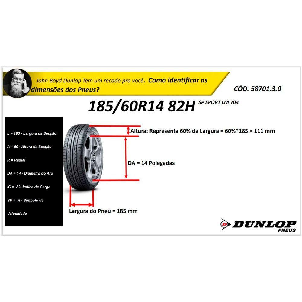 Kit 4 Pneus Dunlop 185/60r14 82h Splm704Garanta mais seguranca, conforto e desempenho para o seu carro com o Kit 4 Pneus Dunlop 185/60R14 82H SP Sport LM704. Desenvolvido com tecnologia japonesa, o LM704 oferece excelente aderencia, estabilidade e durabilidade, sendo a escolha perfeita para quem busca qualidade e economia.Seu design moderno com sulcos otimizados melhora a drenagem de agua, reduz o risco de aquaplanagem e proporciona uma conducao mais silenciosa e suave em qualquer tipo de pista. Com composto de borracha aprimorado e silica na banda de rodagem, o pneu entrega menor resistencia ao rolamento e maior eficiencia no consumo de combustivel.Ideal para veiculos de passeio com rodas aro 14, como Gol, Fox, Palio, Corsa, Uno e similares, o Kit com 4 pneus oferece excelente custo-beneficio, garantindo uniformidade e equilibrio na dirigibilidade.Dimensoes do produtoAltura: 57,8 cmLargura: 18,5 cmProfundidade: 57,8 cmPeso: 7,76 KgGarantia do fornecedor: 60 meses