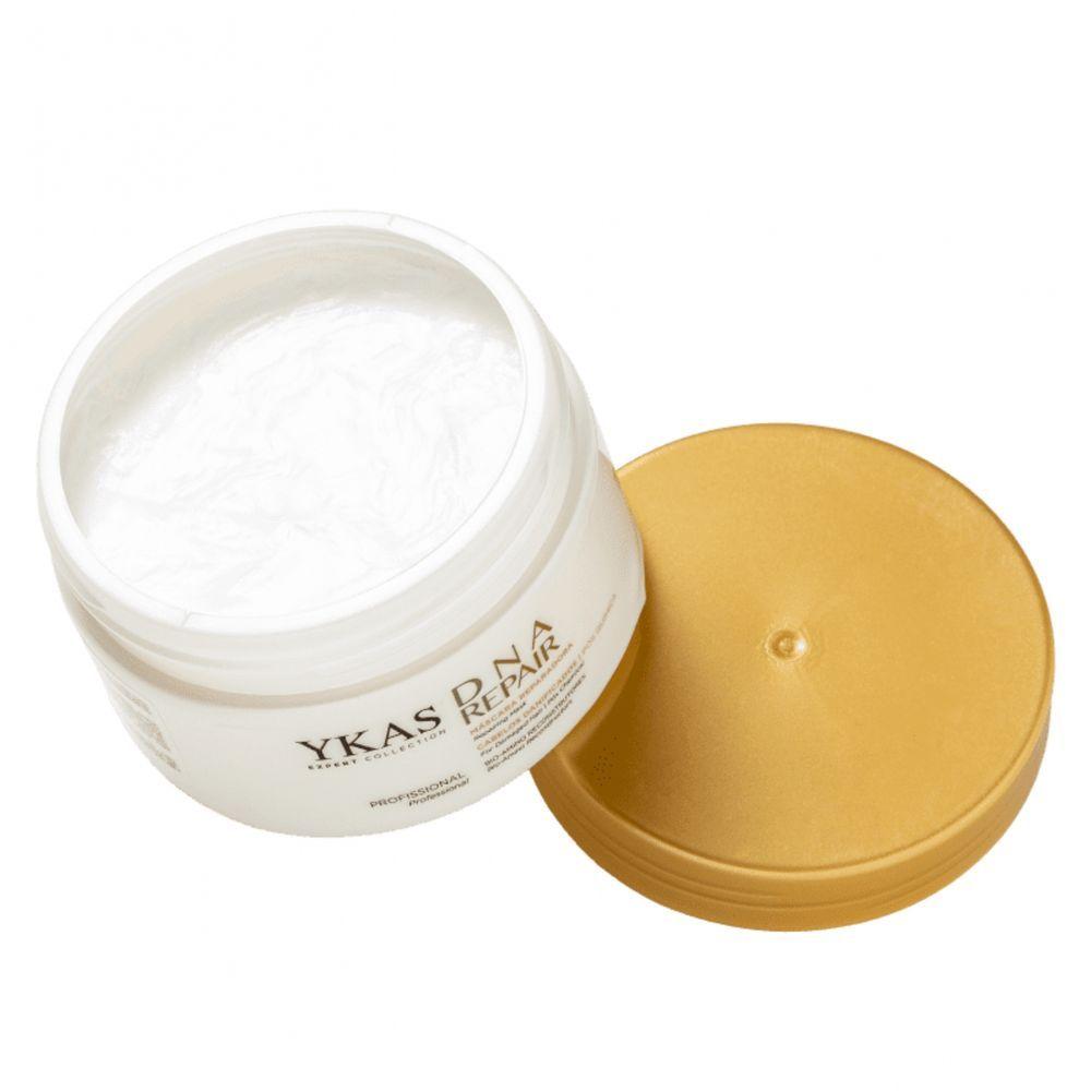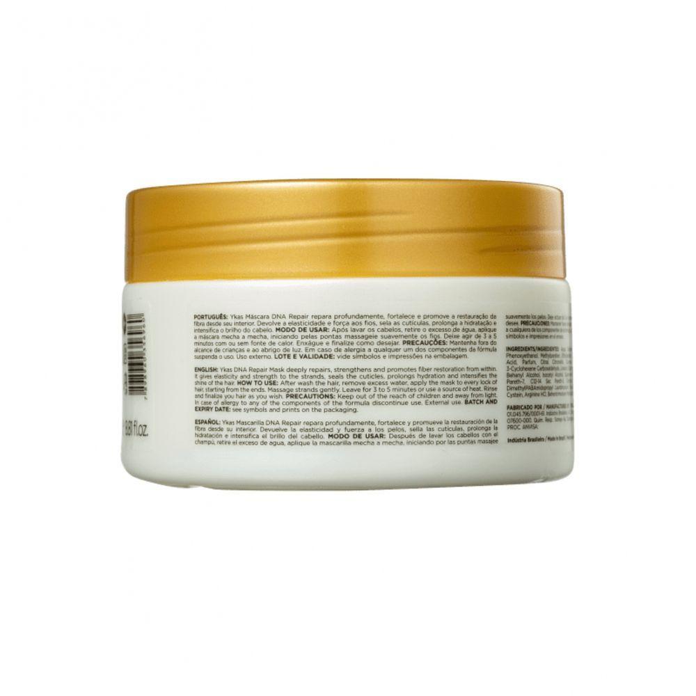 Ykas Dna Repair - Máscara Capilar 250g Kit de tratamento para cabelos danificados após procedimentos químicos. O Kit YKAS DNA Repair Trio faz uma reparação intensiva dos fios enquanto limpa e desembaraça o cabelo.O Kit YKAS DNA Repair Trio faz uma reposição de proteínas nos fios sensibilizados para recuperar a resistência perdida com as agressões externas. Assim, é um ótimo aliado no tratamento aos cabelos que passaram por químicas.Contém:YKAS DNA Repair - Shampoo 1000ml: ajuda na reparação da fibra capilar durante a limpeza.YKAS DNA Repair - Condicionador 1000ml: reconstrói a fibra capilar durante o cuidado diário, que deixa os fios mais fáceis de pentear.YKAS DNA Repair - Máscara Capilar 250g: repara profundamente os fios para que eles restaurem sua força perdida.MODO DE USO:Aplique o shampoo nos cabelos úmidos massageando suavemente. Depois enxague abundantemente. Se preferir uma limpeza mais profunda repita todo o processo.Passe a máscara sobre o cabelo limpo e úmido. Espalhe pelo comprimento e pontas e massageie mecha a mecha, enluvando. Deixe agir por 5 minutos. Em seguida, enxágue bem.Espalhe o condicionador do comprimento às pontas. Deixe agir por 2 minutos e enxágue.SE LIGA NA DICA:Evite dormir com o cabelo molhado. Os fios úmidos ficam frágeis e quebram mais em contato com o travesseiro.Ação / ResultadoBio-Amino Reconstrutores: repõem as proteínas perdidas para reparar e fortalecer a estrutura do fio.Seu cabelo fica limpo, desembaraçado, restaurado e muito mais resistente.