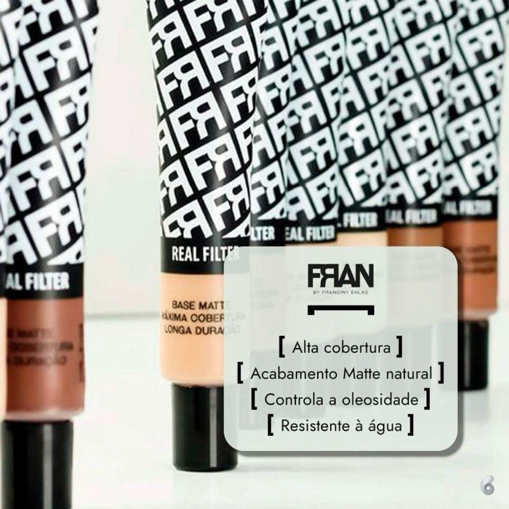 Real Filter Fran By Franciny Ehlke M-02 - Base Matte Real Filter Fran by Franciny Ehlke M-02- Base com acabamento matte e alta cobertura. Fran by Franciny Ehlke Real Filter Confere longa duração, além de ser resistente à água.- A Base Matte Fran by Franciny Ehlke Real Filter conta com Ácido Hialurônico em sua fórmula, que ajuda a manter o equilíbrio e a hidratação da pele enquanto evita que craquele. Controla a oleosidade e confere um resultado impecável o dia todo.- Fórmula vegana, sem parabenos, livre de poluentes e radicais livres. Sem glúten, sem fragrância e não testado em animais.Conselho de Aplicação- Aplique a sua base no rosto com um pincel próprio ou uma esponja de maneira uniforme.Nossos Experts Ensinam- Para um acabamento mais natural, aplique um hidratante previamente à maquiagem.- Pele perfeita, com as imperfeições disfarçadas com naturalidade e durabilidade.