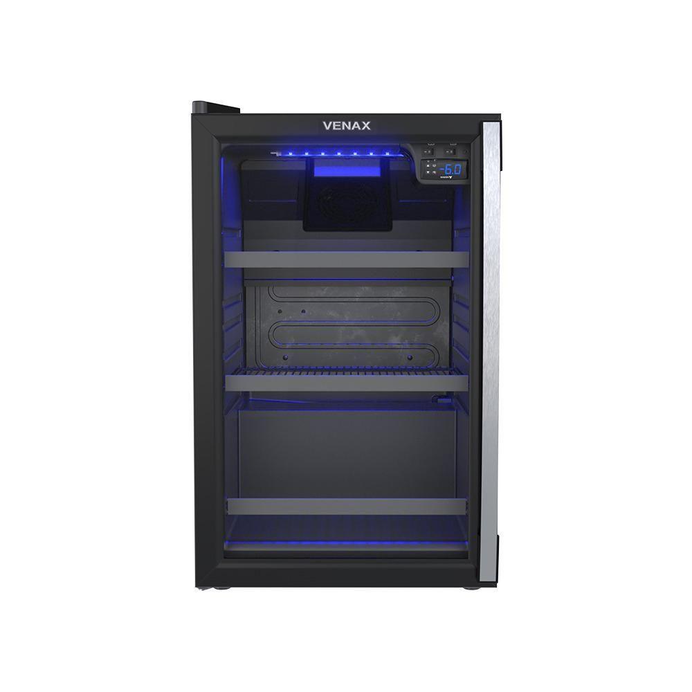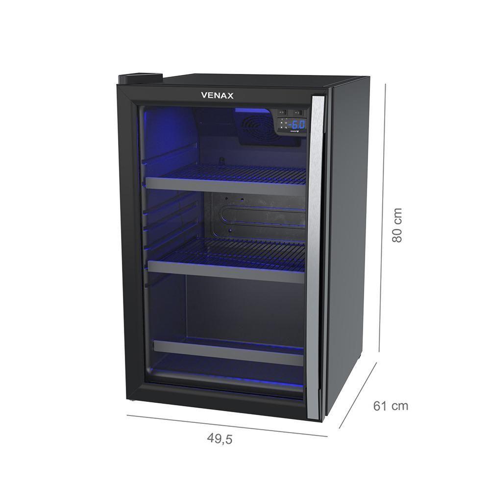 Cervejeira Expositora 100l Blue Light Porta De Vidro Invertida Expvqbl100pi 127v - Venax 127vMUITO IMPORTANTE:-- CONFERIR PRODUTOS NO ATO DO RECEBIMENTO. NÃO ACEITAR PRODUTOS COM EMBALAGEM VIOLADA (AMASSADO, RASGADO, ABERTO, QUEBRADO, ETC), A RECUSA DEVE SER FEITA NO ATO.Cervejeira Expositora 100L Blue Light Porta de Vidro Invertida EXPVQBL100PI 127V - Venax- Tipo: Cervejeira;- Controlador de Temperatura: Digital, Regulável(0°C a -6°C);- Iluminação Interna: LED Azul;- Porta: Vidro Duplo;- Aquecimento da Porta: Sim;- Puxador da Porta: Alumínio;- Abertura da Porta: Direita Para Esquerda;- Trava de Abastecimento: Não;- Degelo: Automático;- Dreno: Traseiro;- Recipiente de Degelo: Sim;- Prateleiras: 2 Reguláveis;- Evaporador: Ar Forçado;- Sistema de Refrigeração: Compressor;- Gás Refrigerante: R134a;- Pés: Frontais Reguláveis e Traseiros com Rolete;- Gabinete Interno: PSAI;- Gabinete Externo: Aço Revestido com Pintura Eletrostática;- Testeira: Não.- Capacidade de Armazenamento:Lata 350ml: 96 / 473ml: 78;Longneck 355ml: 48;Garrafa 600ml: 34 / 1L: 20;Marca: Venax.Especificações Técnicas:- Frequência: 60Hz;- Isolamento Térmico: Poliuretano;- Etiquetas: Selo de Segurança;- Garantia: 1 Ano;- Potência: 200W;- Volume Líquido: 82L;- Medidas totais: 80cm A x 49,5cm L x 61cm P;- Medidas da embalagem: 85cm A x 51cm L x 63cm P;- Peso líquido: 33,5kg;- Peso bruto: 38kg.Cor: Preto | Tensão Elétrica: 127V | Produto: Cervejeira | Capacidade em volume: 82 Voltagem: 127V