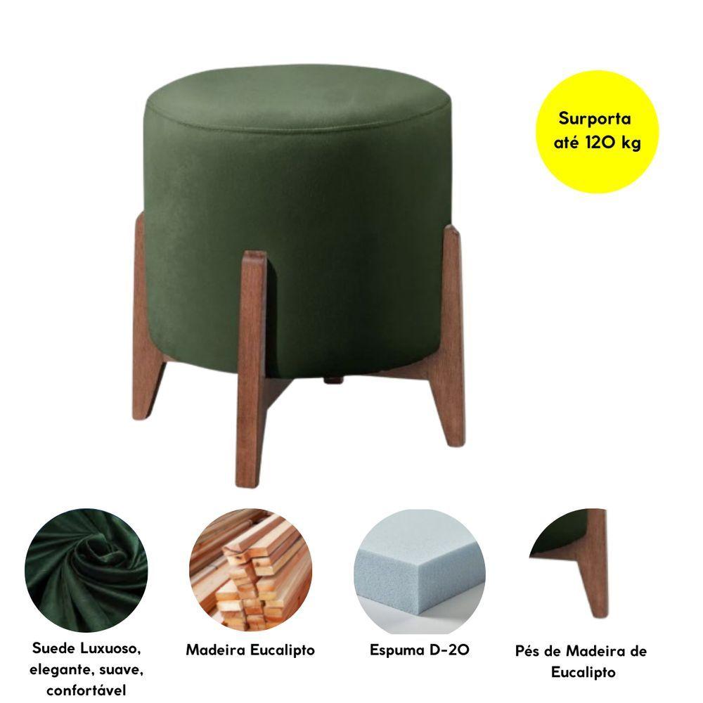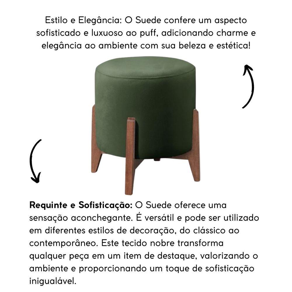 Puff Decorativo Redondo Sala De Estar Eloá Suede Cor:verdeO Puff Para Sala é a escolha ideal pra você que busca mais conforto e elegância para o seu ambiente! Esse Puff Decorativo possui um design único e versátil para compor diferentes espaços da sua casa, como sua sala de estar, quarto, escritório e recepção ou até para quando receber visitas e quiser um lugar extra para acomodar os amigos, é aquele item que consegue fazer toda a diferença nos momentos de descontração e receptividade.O Puff Redondo para sala de estar é revestido em tecido Suede, base em madeira eucalipto deixando os pés aparentes trazendo um toque de modernidade, é o móvel perfeito para valorizar a sua decoração.Garanta já o seu Puff Estofado moderno para quarto e ouse na sua utilização deixando seu ambiente ainda mais lindo!Dimensões:Altura: 43 cmLargura: 40 cmProfundidade: 40 cmAltura dos Pés: 11 cmPeso: 7 KgPeso Suportado: 120 KgEspecificações do Produto:Estrutura: Madeira EucaliptoDensidade da Espuma: Assento D-23Tecido: Suede.Material dos pés: Madeira Eucalipto.Montagem: O produto vai montado.Instruções de Limpeza: Utilizar um pano limpo e levemente úmido.Você irá receber: 01 volume.Observações Relevantes:Produto para uso residencial em ambiente interno, não devendo ficar exposto diretamente ao sol, calor e umidades excessivas.Pode haver alguma diferença de tonalidade entre a imagem e o produto real, por conta do tratamento de imagens e a calibração de cores do seu monitor.As imagens são meramente ilustrativas, não acompanham objetos de decoração e eletros.retrôsentarpequenoinfantilcouropersonalizadomadeiraacolchoadodobrávelescritóriocoloridoPequenoMinimalistaambientes externosquadradobaúgrandecamavarandaluxosustentável