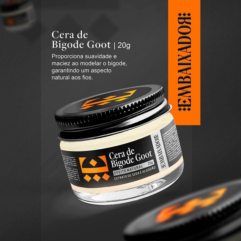 Cera Para Bigode Goot Embaixador 20gCera para Bigode Goot Embaixador 20gA Cera para Bigode Goot proporciona suavidade e maciez ao modelar o bigode, garantindo um aspecto natural aos fios.Modo de usoAplique uma pequena quantidade do produto nas pontas dos dedos. Espalhe no bigode e modele conforme desejar. Uso sem enxágue.Uso externo. Não ingerir. Mantenha fora do alcance de crianças. Armazene em local fresco, arejado e longe da luz do sol. Em caso de contato com os olhos e boca, lave com água em abundância. Se persistir a irritação, procure um médico. Após o uso, mantenha a embalagem fechada.OBS: Nenhum produto da Emabiaxador Cosméticos é testado em animais, ou seja, este item possui selo Cruelty Free.