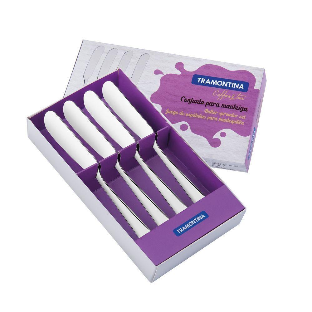 Conjunto De Espátulas Tramontina Cosmos Para Manteiga Em Aço Inox Acabamento Alto Brilho 4 Peças TramontinaConjunto de Espátulas Tramontina Cosmos para Manteiga em Aço Inox Acabamento Alto Brilho 4 Peças Tramontina -Nada como passar manteiga em um pão quentinho no café da manhã. O Conjunto de Espátulas para Manteiga em Aço Inox Acabamento Alto Brilho 4 Peças da linha Cosmos, proporcionará para a sua mesa beleza e praticidade.Todas produzidas em aço inox, altamente duráveis, as suas características serão preservadas por muito mais tempo.OrientaçõesPeças totalmente feitas de aço inox, altamente duráveis, mantêm suas características , preservando a beleza, a higiene e a durabilidade do material.Acabamento em brilho.Próprias para diário combinam com qualquer ambiente.Podem ser lavadas diariamente na máquina de lavar louças.ObservaçõesDurante a lavagem, use apenas sabão ou detergente e uma esponja macia. Outros tipos de produtos, como palha de aço, poderão riscar ou prejudicar o brilho dos talheres.Enxágue bem cada peça a fim de remover totalmente os resíduos dos produtos de limpeza, pois, por serem abrasivos, podem prejudicar o inox.Sempre que possível, use água quente, pois renova o brilho do talher.Após a lavagem, enxugue imediatamente os talheres, caso contrário, as substâncias químicas da água (cloro) poderão causar manchas.Evite atrito entre os talheres durante o processo de lavagem e no armazenamento, para mantê-los sem riscos.Evite o contato das peças com superfícies quentes. Elas provocam a descoloração do produto.Não guarde os talheres em locais úmidos. A umidade também provoca manchas.Ao usar a lava-louça, recomendamos retirar os talheres logo que tenha terminado o ciclo enxaguar, a fim de que sejam secados manualmente.Características GeraisEAN137891116080948DUN1417891116080945NCM8215.99.10Peso Líquido0,0600 kg.Peso Bruto0,0850 kg.Metragem0,000259 m³.Dimensões Embalagem (Compr. X Larg. X Alt.)155x 93x 18 mm.Características Gerais do Produto:Garantia: - 1 Ano