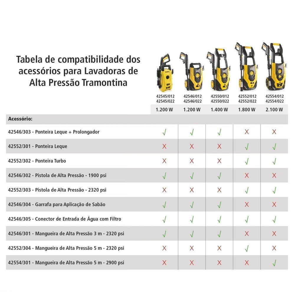 Pistola De Alta Pressão Para Lavadora De Alta Pressão Tramontina TramontinaPistola de Alta Pressão para Lavadora de Alta Pressão Tramontina Tramontina -Seja para lavar a moto, o carro ou a bicicleta, ter os acessórios certos faz toda a diferença. Por isso, a Pistola de Alta Pressão para Lavadora de Alta Pressão Tramontina é a escolha ideal. A pistola possui trava de segurança que impede que o gatilho seja acionado de forma involuntária e dispositivo de engate rápido que deixa sua limpeza mais ágil e prática.OrientaçõesPressão máxima: 16 Mpa; 160 bar; 2320 psiTemperatura máxima de operação: 60°CAdaptável as lavadoras de alta pressão Tramontina:42552/01242552/02242554/01242554/022Características GeraisEAN137891114164473DUN1417891114164470NCM8424.90.90Peso Líquido0,6500 kg.Peso Bruto0,6800 kg.Metragem0,004365 m³.Dimensões Embalagem (Compr. X Larg. X Alt.)485x 200x 45 mm.Dimensões Produto (Compr. X Larg. X Alt.)440x 180x 180 mm.ObservaçõesSempre utilizar óculos de segurança para proteger os olhos;Utilizar luvas e protetor auricular;Utilizar sapatos antiaderentes para proteger os pés e evitar quedas;Sempre prestar atenção na tensão indicada no produto antes de usá-lo;Nunca tocar no plugue ou na tomada com as mãos molhadas;Não trabalhar em posições anormais;Nunca direcionar o jato de água a pessoas ou a si mesmo;Ao utilizar extensões, utilizar plugues e soquetes a prova de água;Recomenda-se consultar o manual de instruções para maiores informações.Características Gerais do Produto:Garantia:- 1 Ano