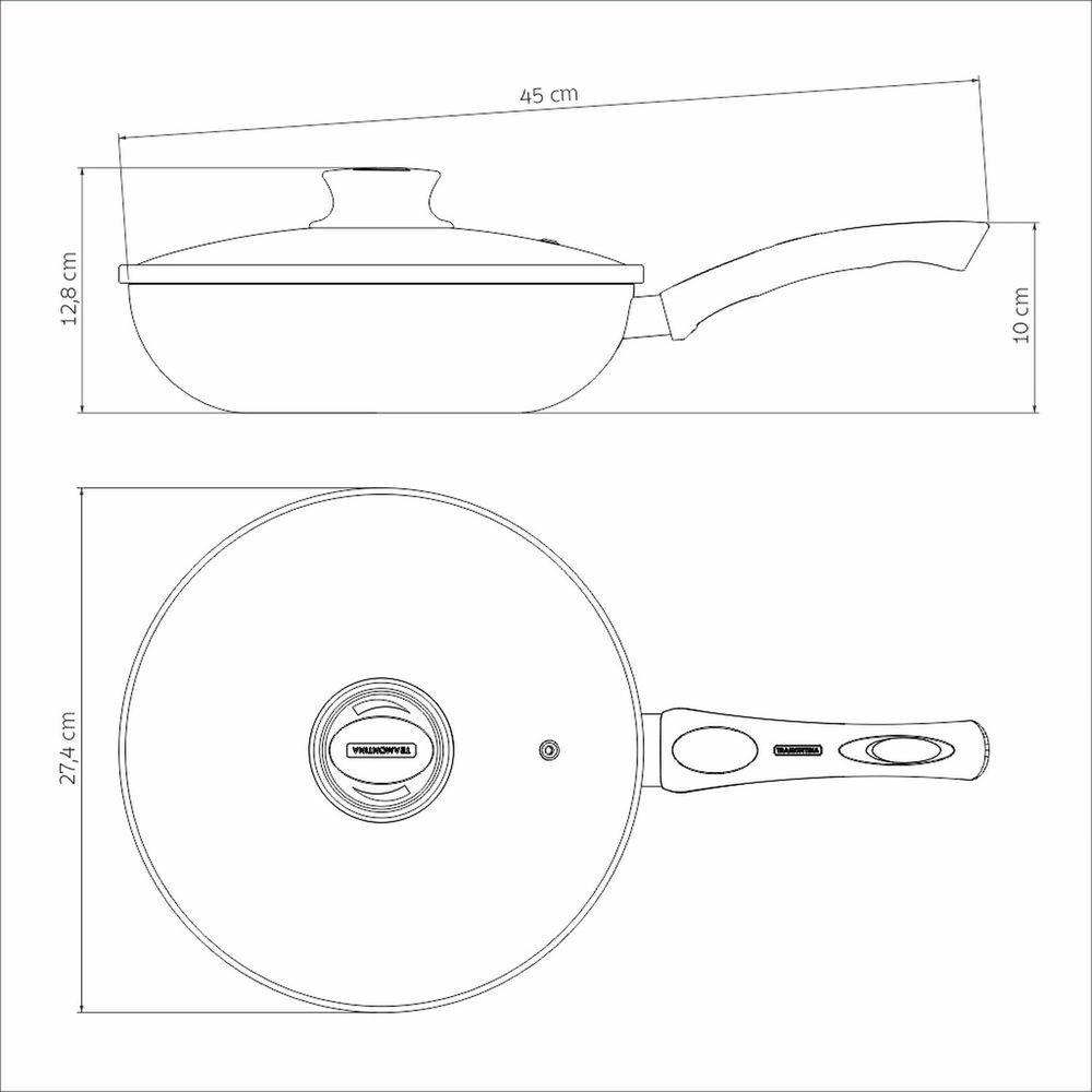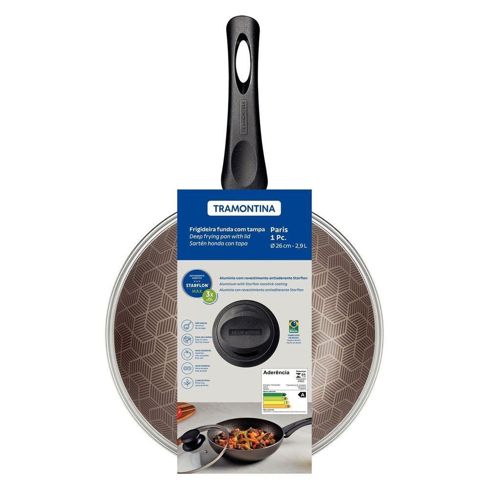 Frigideira Funda Tramontina Paris Antiaderente Starflon Max Vermelho Tampa Vidro 26 Cm 2,9 L TramontinaFrigideira Funda Tramontina Paris Antiaderente Starflon Max Vermelho Tampa Vidro 26 cm 2,9 L Tramontina -Frigideira Funda Tramontina Paris Antiaderente Starflon Max Vermelho Tampa Vidro 26 cm 2,9 LA frigideira funda Tramontina Paris em alumínio com revestimento interno e externo em antiaderente Starflon Max vermelho com tampa de vidro 26 centímetros 2,9 litros vai ser sua melhor ajudante no preparo das suas refeições. Com ela, você pode preparar frituras em imersão de maneira rápida e fácil, pois é produzida em alumínio com espessura de 2 milímetros. Seu revestimento interno e externo é em Starflon Max, característica que evita que os alimentos grudem em sua superfície, a torna fácil de limpar, mais durável e não prejudicial a saúde, pois é livre de PFOA. Para sua segurança, o cabo em baquelite antitérmico não aquece e deixa seu manuseio muito mais seguro e confortável. Além de todos esses atributos incríveis, ela ainda pode ir à máquina de lavar louças e vai facilitar seu dia a dia!Corpo de alumínio com espessura de 2 mm que proporciona cozimento rápido e uniforme. Revestimento interno e externo de antiaderente Starflon Max que não gruda, é fácil de limpar, mais durável e não é prejudicial à saúde, pois é livre de PFOA.Cabo de baquelite antitérmico que oferece segurança durante o manuseio. Pode ir à máquina de lavar louças facilitando seu dia a dia.Pode ser utilizada nos fogões: gás, elétrico e vitrocerâmico - resistência elétrica.Cuidados com o produto A capacidade volumétrica máxima para cozimento é de 3/4 da capacidade total da peça. Posicione o cabo do utensílio voltado ao centro do fogão.Em fogões com grade, centralize a peça sobre a chama ou fonte de calor e alinhe o cabo com a grade. Utensílios quentes devem estar fora do alcance das crianças. Antes do primeiro uso, lave com esponja macia, sabão neutro ou detergente líquido. Depois de secar, unte a área interna com óleo ou gordura e leve ao fogo por um ou dois minutos. Deixe esfriar e lave novamente. Seu utensílio Starflon está pronto para uso com ou sem gordura, sempre em fogo baixo ou médio (nunca superior a 260 ºC). Para mexer os alimentos use somente utensílios de silicone, nylon ou madeira. Com o uso, o cabo pode afrouxar devido à dilatação normal dos materiais. Reaperte apenas o suficiente, sem forçar. Limpeza: Evite a imersão do utensílio quente em água fria. Nunca utilize produtos abrasivos na lavagem. Se deixar queimar alimentos, umedeça a área e reserve até que possa remover os resíduos grudados com esponja e sabão. Para descarte do produto e embalagem siga as orientações de reciclagem vigentes.Garantia90 dias para vícios ou defeitos de fabricação. - Produto com certificação compulsória certificada pelo OCP 0040 - SGS, registro 001793/2018, modelo frigideira funda e classificação de antiaderência A (ótima), conforme portaria INMETRO 499/2021. -Características Gerais do Produto:Garantia: - 3 Meses