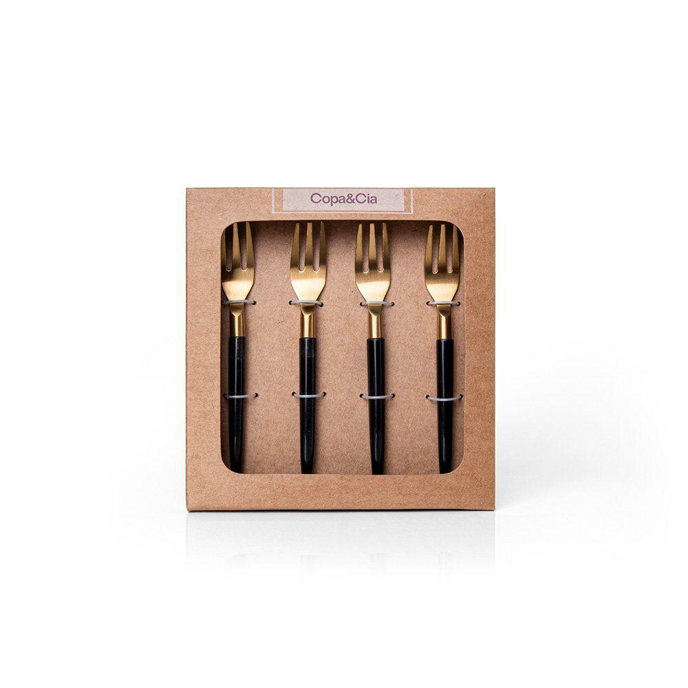 Conjunto De Talheres Copa E Cia Para Aperitivo Finger Food 4 Peças Garbo Stone SlimConjunto de Talheres Copa e Cia para Aperitivo Finger Food 4 Peças Garbo Stone Slim -Características Gerais do Produto: - Composição: Composição por linha de talheres:; Rattan: em aço inoxidável gold com cabo de rattan natural.; Atenas: em aço inoxidável gold com cabo de madrepérola.; Monza: em aço inoxidável silver com cabo de resina.; Goldwood: em aço inoxidável gold com cabo de madeira.; Turim: em aço inoxidável gold com cabo de resina.; Ilhéus: em aço inoxidável com cabo de resina.; Bamboo Natural: em aço inoxidável disponível nas versões gold ou silver, com cabo de bambu natural.; Rattan Natural: em aço inoxidável silver com cabo de rattan.; Luma Silver: em aço inoxidável silver com cabo de acrílico.; Stone Slim: em aço inoxidável gold com cabo em resina.; Opal Wood: em aço inoxidável gold com cabo de madeira e resina. - Detalhes: Design Exclusivo Copa&Cia.; Produzido na Índia.; As cores podem sofrer pequenas alterações de cor, variando de monitor para monitor.; Os objetos que ambientam as fotos não acompanham o produto.; As fotos produzidas são apenas como sugestão de uso com as demais peças da coleção. - Cuidados: Não Armazenar as Peças Todas Juntas, Poderá Provocar Riscos.; Lavar com Detergente Neutro e Esponja Macia.; Não Deixar de Molho.; Secar Bem e Armazenar em Local Seco e Arejado.; Lavar Manualmente; Não podem ser colocados em lava-louças.; Não utilizar solventes, abrasivos ou alvejantes. - Dimensões (cm): Dimensão da Embalagem: Altura: 3 cm, Largura: 14 cm, Comprimento : 17,5 cmAcompanha o produto: - 4 Peças de Garfos para Aperitivo Garantia: - 7 dias/30 dias contra defeito de fabricação