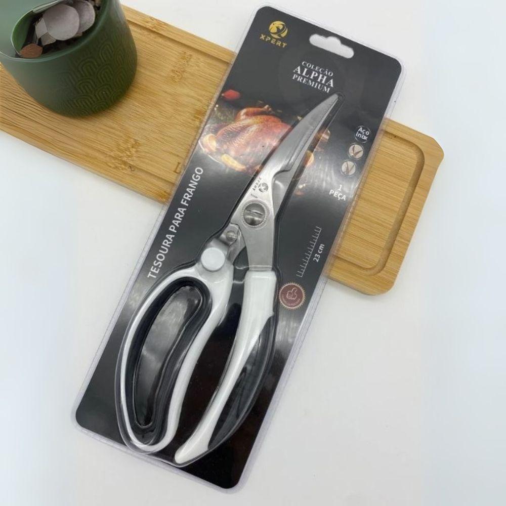 Tesoura Culinária Para Frango 23cm Para Ossos Sem EsforçoFerramenta perfeita para quem busca precisão, resistência e praticidade no preparo de carnes, essa tesoura foi desenvolvida especialmente para cortar frango, mas também é excelente para carnes em geral, ossos mais leves, ervas e até embalagens na cozinha.Fabricada com lâminas em aço inox de alta durabilidade, ela garante cortes firmes e precisos, sem esforço, mesmo em partes mais rígidas das aves.Seu cabo anatômico em polipropileno oferece pegada confortável e segura, ideal para uso prolongado e com estabilidade, mesmo em ambientes úmidos ou com gordura.A tesoura conta ainda com sistema de trava de segurança e mola de abertura automática, que facilita o manuseio e evita acidentes durante o uso ou armazenamento.Com acabamento premium e alta performance, é um utensílio indispensável para cozinheiros exigentes, chefs de cozinha, açougues, churrasqueiros ou para o uso doméstico do dia a dia.Acompanha embalagem blister resistente, que protege o produto e o valoriza no ponto de venda.Eleve a eficiência da sua cozinha com a Tesoura robusta, funcional e feita para durar.Especificações:Dimensões: 23cm altura x 8cm diâmetroComposição: Aço InoxCor: Inox com Cabo BrancaPeso: 170gContém:01 Tesoura Culinária Para Frango