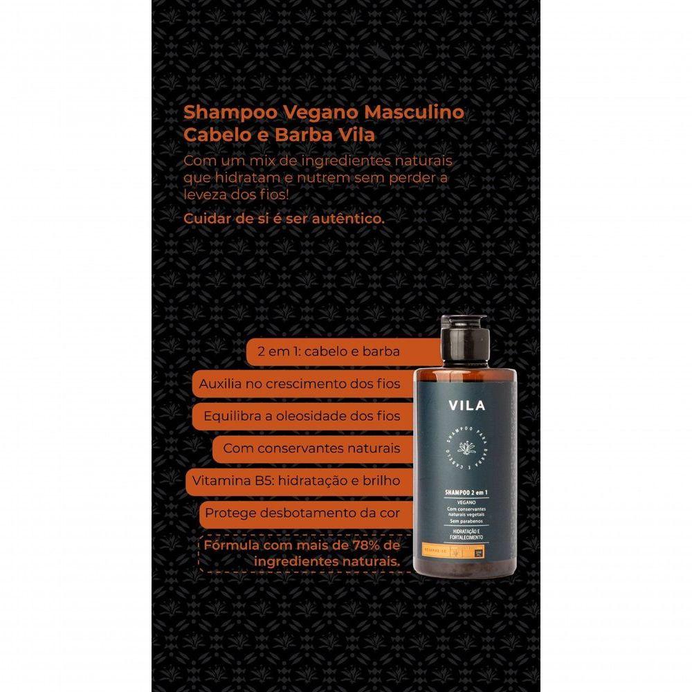 Shampoo Vegano Masculino Cabelo E Barba Vila 250mlShampoo Multifuncional Masculino Cabelo e Barba Vila 250mlShampoo multifuncional para cabelo e barba com propriedades que hidratam e fortalecem os fios, promovendo limpeza profunda mantendo a leveza e suavidade de cabelos saudáveis.Nosso shampoo cabelo e barba é rico em D-pantenol, uma vitamina poderosa que age formando um filme lubrificante sobre os fios, promovendo hidratação duradoura, prevenindo danos e adicionando brilho. Sua ação anti-inflamatória é muito benéfica para o couro cabeludo, já que muitas condições incômodas como caspa, dermatite seborreica, queda dos fios, coceira, entre outros, são originadas por processos inflamatórios. Sua textura leve e não gordurosa ajuda também a equilibrar a oleosidade.O uso frequente do nosso shampoo cabelo e barba gera grandes resultados para os fios, reduzindo queda e caspa.Fórmula desenvolvida especialmente para homens que buscam estilo e personalidade sem perder a praticidade.Cuidar de si é ser autêntico.Ingredientes ativos:Mix de proteínas hidrolisadas de arroz, trigo, quinoa e linhaça: Aminoácidos e fibras de alta compatibilidade com os fios, proporcionando recuperação, luminosidade e força;D-pantenol (pró-vitamina B5): Brilho e hidratação de longa duração. Age formando um filme lubrificante sobre os fios, promovendo hidratação duradoura, prevenindo danos e adicionando brilho. Sua ação anti-inflamatória também pode ser muito benéfica para o couro cabeludo, já que muitas condições incômodas como caspa, dermatite seborreica, queda dos fios, coceira, entre outros, são originadas por processos inflamatórios. Sua textura leve e não gordurosa ajuda também a equilibrar a oleosidade dos fios;Extrato de cana-de-açúcar: Hidratação e alinhamento das cutículas dos fios da barba e do cabelo, reduzindo o frizz;Extrato de orquídea: Maciez e Hidratação;Extrato de Goji Berry e Blueberry: Ricos em diferentes tipos de vitamina pro cabelo, como vitamina B, C e E. As vitaminas C e E têm ação antioxidante que retarda o nascimento de fios brancos, previne o desbotamento dos fios e o envelhecimento capilar e as vitaminas do complexo B ajudam a dar brilho e maciez aos fios;Conservante vegetal: Blend de ésteres 100% vegetais com certificação orgânica ECOCERT que, além de conservarem o produto, promovem emoliência e hidratação à pele e cabelos.Fórmula com mais de 78% de ingredientes naturais.Características Gerais do Produto:- Benefícios do Produto: Promove limpeza e hidratação. Produto rico em ingredientes naturais e orgânicos. Ingredientes ativos: Mix de proteínas hidrolisadas de arroz, trigo, quinoa e linhaça: Aminoácidos e fibras de alta compatibilidade com os fios, proporcionando recuperação, luminosidade e força. D-pantenol (pró-vitamina B5): Brilho e hidratação de longa duração. Extrato de cana-de-açúcar: Hidratação e alinhamento das cutículas dos fios da barba e do cabelo, reduzindo o frizz.- Código Anvisa: 25351.294541/2020-91- Ingredientes: Composição: Aqua, Sodium Laureth Sulfate, Decyl Glucoside, Cocamidopropyl Betaine, Cocamide MEA, Acetamide MEA, Glyceryl Caprylate*, Glyceryl Undecylenate*, Parfum, Stearamidopropyl Dimethylamine, Panthenol, PEG-150 Distearate, Glycol Distearate, Dimethiconol, Guar Hydroxypropyltrimonium Chloride, Phalaenopsis Amabilis Extract, Polyquaternium-10, Dipropylene Glycol, Amodimethicone, Coco-Glucoside, Sodium Gluconate, Hydrolyzed Rice Protein, Saccharum Officinarum (Sugar Cane) Extract, Benzyl Alcohol, Glyceryl Oleate, Glyceryl Stearate, Hydrolyzed Linseed Seed, Hydrolyzed Quinoa, Hydrolyzed Wheat Protein, Lycium Barbarum Fruit Extract, Vaccinium Myrtillus Fruit Extract, Sodium Benzotriazolyl Butylphenol Sulfonate, Cyclotetrasiloxane, Propanediol, Cetrimonium Chloride, Citric Acid, Cyclopentasiloxane, TEA-Dodecylbenzenesulfonate, Trideceth-12, Vegetable Glycerin, Benzoic Acid, Sodium Benzoate, Cynara Scolymus Leaf Extract. *Conservantes vegetais. Sem adição de cloreto de sódio.