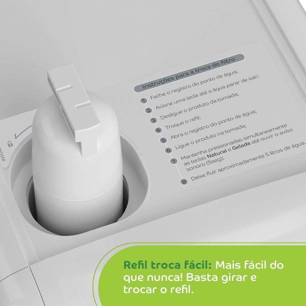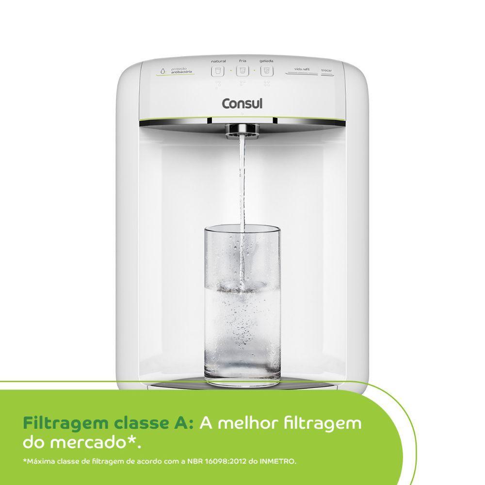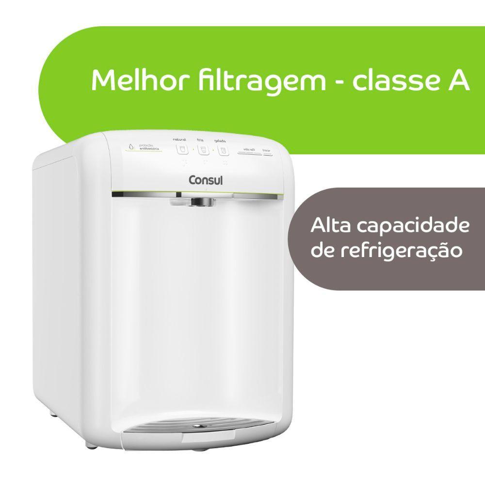 Purificador De Água Consul De Alta Capacidade De Refrigeração CPB36AB Branco 220VDescriçãoCom sistema de alta capacidade de refrigeração e um painel funcional, o Purificador Consul permite a seleção entre 3 níveis de temperatura — natural, fria ou gelada — além de possuir indicador gradual de vida útil do refil, lembrando o momento certo para a troca.Diferenciais ConsulAlta Capacidade de RefrigeraçãoCom sistema de compressor, o Purificador de Água Consul possui alta capacidade de refrigeração, gelando mais água em muito menos tempo. Ter água gelada nunca foi tão fácil!3 Níveis de TemperaturaPainel funcional que permite escolher entre três temperaturas diferentes — natural, fria ou gelada — facilitando o seu dia a dia até nas escolhas mais simples.Indicador de Vida Útil do RefilDisplay gradual de vida útil do refil que ajuda a lembrar a hora certa de trocá-lo, garantindo água sempre pura e ideal para o consumo.Proteção AntibactériasAtravés de um filtro com eficiência bacteriológica, a Consul traz mais saúde para sua família.Refil Troca FácilSem complicações e sem precisar da ajuda de um técnico: basta girar e trocar o refil. Simples e fácil!Especificações TécnicasCor: BrancoVoltagem: 220VRefrigeração: Água natural e geladaVazão: 40 – 60 L/hRetenção de Partículas: Classe APlugue e Tomada: 10 AProdutos Compatíveis: W11198953; W11199342; W10301562; CJ_W11199342_2; CJ_W11199342_3; CJ_W10301562_2; CJ_W10301562_3Filtro Compatível: W11198953; W11199342; W10301562; CJ_W11199342_2; CJ_W11199342_3; CJ_W10301562_2; CJ_W10301562_3Mais Informações: Com sistema de alta capacidade de refrigeração e painel funcional, permite selecionar entre 3 níveis de temperatura (natural, fria ou gelada) e possui indicador gradual de vida do refil.Temperatura de Operação: 10°C a 32°CDimensões e Peso AproximadosAltura: 32,8 cmLargura: 24 cmProfundidade: 29,6 cmPeso: 3,9 kgGarantia12 meses (3 meses de garantia legal e 9 meses de garantia para defeitos de fabricação).ObservaçõesCertifique-se da montagem correta de todas as partes antes do uso.Verifique o prazo de garantia no manual de instruções.Em caso de problemas, procure uma assistência técnica autorizada.Importante: imprescindível a conferência no ato da entrega. Em caso de anormalidade, recuse o recebimento.Todas as informações divulgadas são de responsabilidade do fabricante e podem sofrer alterações sem aviso prévio.Imagem meramente ilustrativa.
