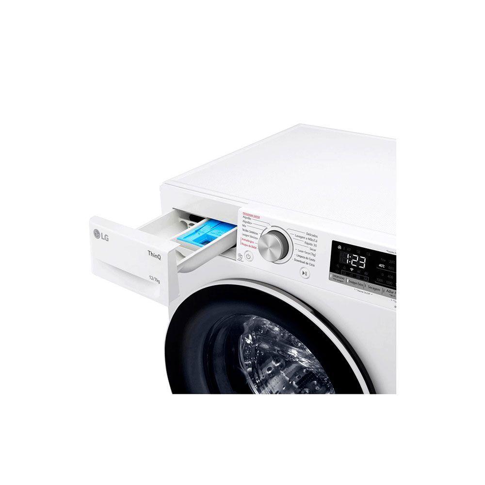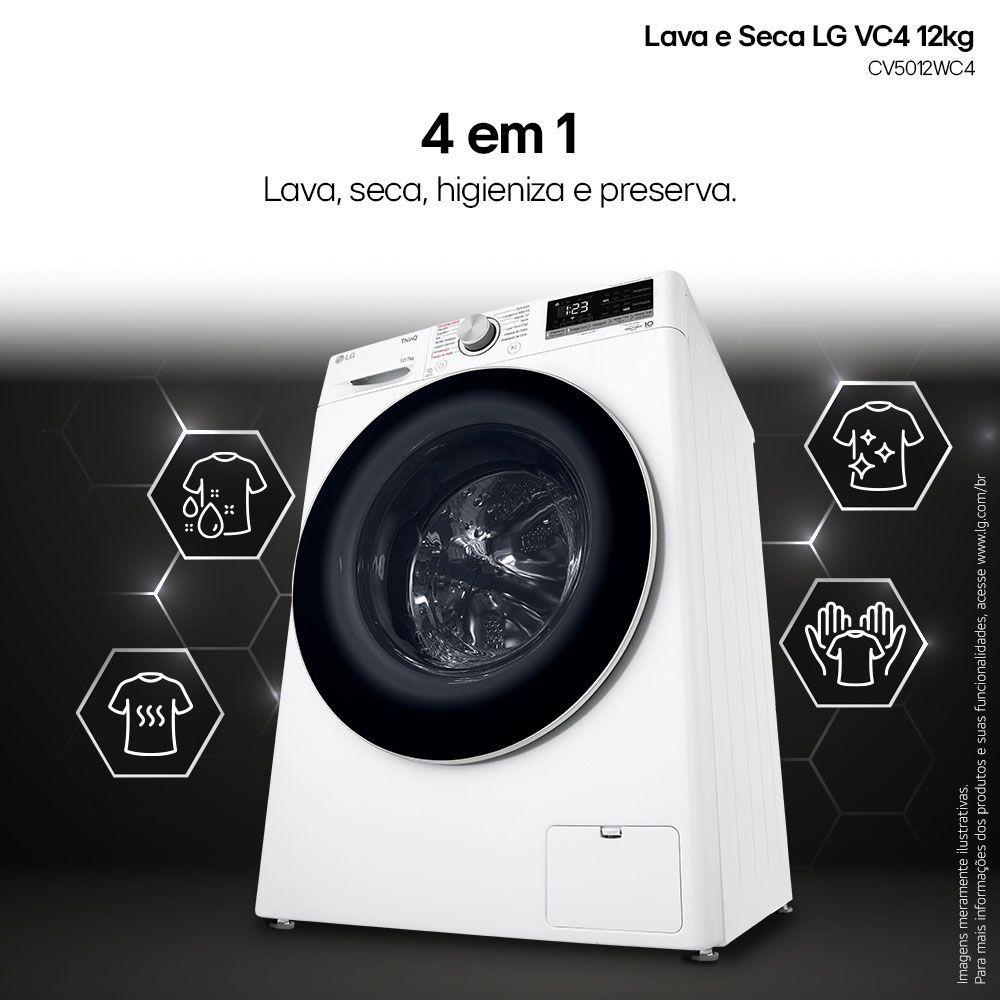 Lava E Seca LG 12kg Smart VC4 Inteligência Artificial AIDD CV5012WC4 Branca 110VLava E Seca LG 12kg Smart VC4 Inteligência Artificial AIDD CV5012WC4 Branca 127VMais Capacidade: Espaço suficiente para lavar itens maiores e volumosos.AI DD: Inteligência Artificial que protege 18% mais as roupas durante a lavagem.Steam: Vapor que elimina 99,9% dos alérgenos.Economia De Água: Um sensor pesa a quantidade de roupa e calcula o quanto de água será necessária para a lavagem, sem desperdício.LG ThinQ: Conexão Wi-Fi e comando de voz pelo Google Assistente com o aplicativo LG ThinQ.Ciclo TurboWash: Ciclos rápidos de 30 minutos de duração.Especificações TécnicaMarca: LGModelo: CV5012WC4Voltagem: 127VMaterial E AcabamentoCor Do Produto: BrancaTipo De Porta: Tampa em vidro temperado preto fumêCapacidadeCapacidade Máxima De Secagem: 7kgCapacidade Máxima De Lavagem: 12kgControle E VisorTemporizador De Adiamento: 3-19 horasTipo De Tela: Mostrador + LED TouchIndicação De Trava Da Porta: SimRecursos6 Motion DD: SimAI DD: SimTipo: Lava e seca Front LoadSinal De Fim De Ciclo: SimSistema Centum: SimAdicionar Item: SimReinício Automático: SimInverter Direct Drive: SimSistema De Detecção De Espuma: SimLoadSense: SimSteam: SimPés Niveladores: SimTambor De Aço Inoxidável: SimCom Tambor Interno: SimSensor De Vibração: SimElevador Do Tambor: Levantador fino de aço inoxidávelAlimentação De Água (Quente/Fria): Apenas frioNível Da Água: AutoTrava De Segurança Infantil: SimSmartSmart Diagnosis: SimDownload De Ciclo: SimMonitoramento De Energia: SimInício Remoto E Monitor De Ciclo: SimThinQ (Wi-Fi): SimInstrutor De Limpeza Do Tambor: SimEmparelhamento Inteligente: SimDimensões E Peso Aproximados Do ProdutoDimensões Do Produto (L x A x P): 60,0 x 85,0 x 56,5 cmPeso (Produto): 73,0 kgGarantia Do ProdutoGarantia Do Produto: 1 ano (3 meses de garantia legal e 9 meses para defeitos de fabricação).Garantia Do Motor: 10 anos de garantia no motor Direct Drive (somente nas peças) conforme política LG. Ver detalhes na garantia LG.Importante: Imprescindível a conferência no ato da entrega. Em caso de anormalidade, recuse o recebimento. Todas as informações divulgadas são de responsabilidade do fabricante, podendo sofrer alterações sem aviso prévio. Imagem meramente ilustrativa.