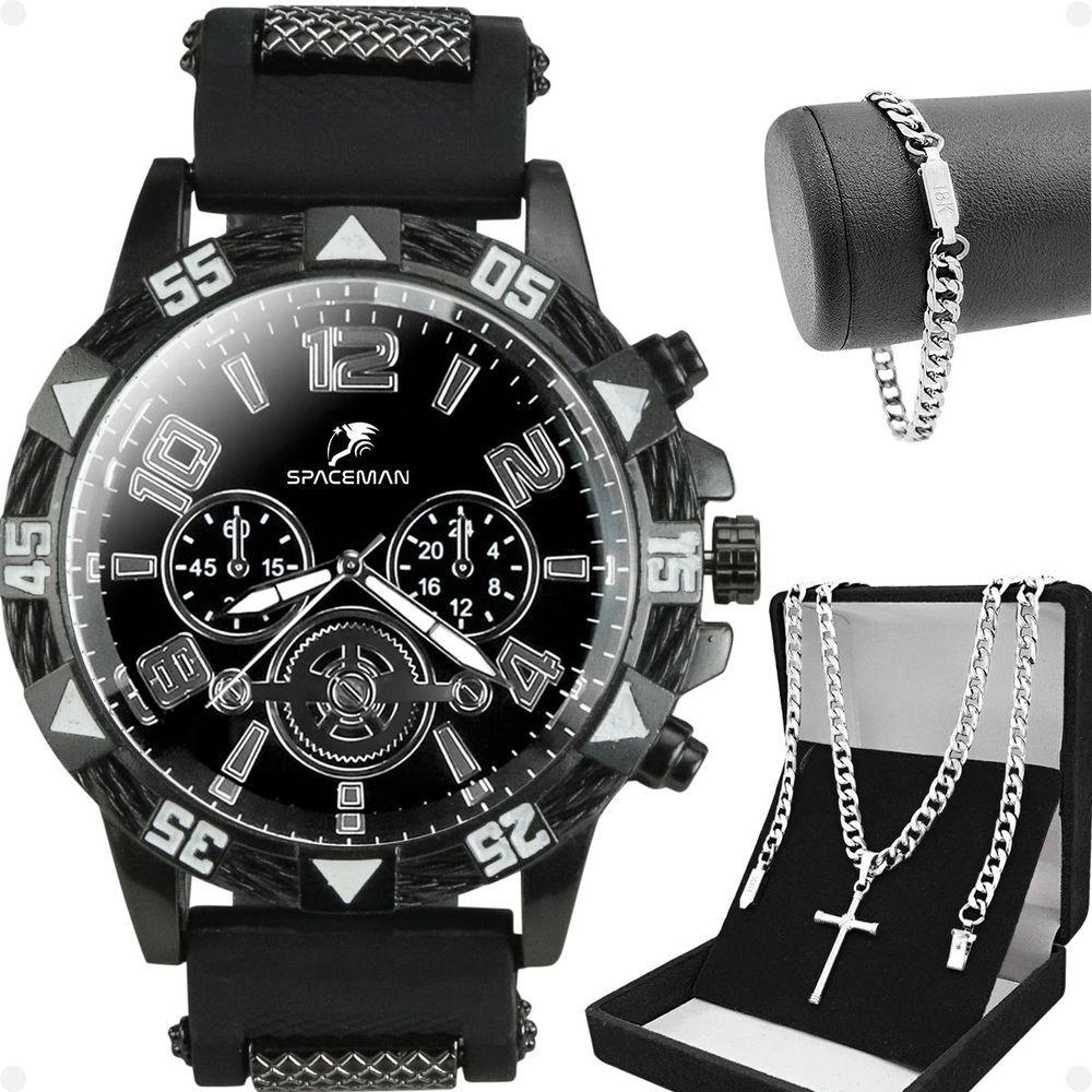 Relogio Masculino Aço Inox + Corrente Cruz + Pulseira Qualidade Premium Pesado Religioso RobustoKit de Acessórios Masculinos Orizom Spaceman - Relógio Analógico e Conjunto de Joias BanhadasChegou a hora de você se destacar com esse Kit de Acessórios Masculinos Orizom Spaceman. Com um relógio analógico de alta qualidade e um conjunto de joias banhadas, este kit é a escolha ideal para homens que valorizam acessórios de qualidade e design requintado.O relógio Orizom Spaceman é à prova d'água, possui maquinário preto e é feito de aço inoxidável, garantindo durabilidade e estilo impecável. Com um mostrador todo preto e pulseira de silicone ajustável, este relógio é perfeito para uso diário ou em ocasiões especiais.Além do relógio, este kit também inclui um cordão Grumet banhado, um pingente em formato de crucifixo com a oração do Pai Nosso gravada a laser e uma pulseira banhada, todos com detalhes elegantes e sofisticados.Se você procura por acessórios que combinem funcionalidade, estilo e significado, este kit é a escolha perfeita. E se você está em busca de um presente para alguém especial ou quer se presentear, este kit é ideal para garantir que você se destaque com acessórios sofisticados e bem coordenados.Não perca a chance de adquirir esse kit incrível e elevar o seu estilo!