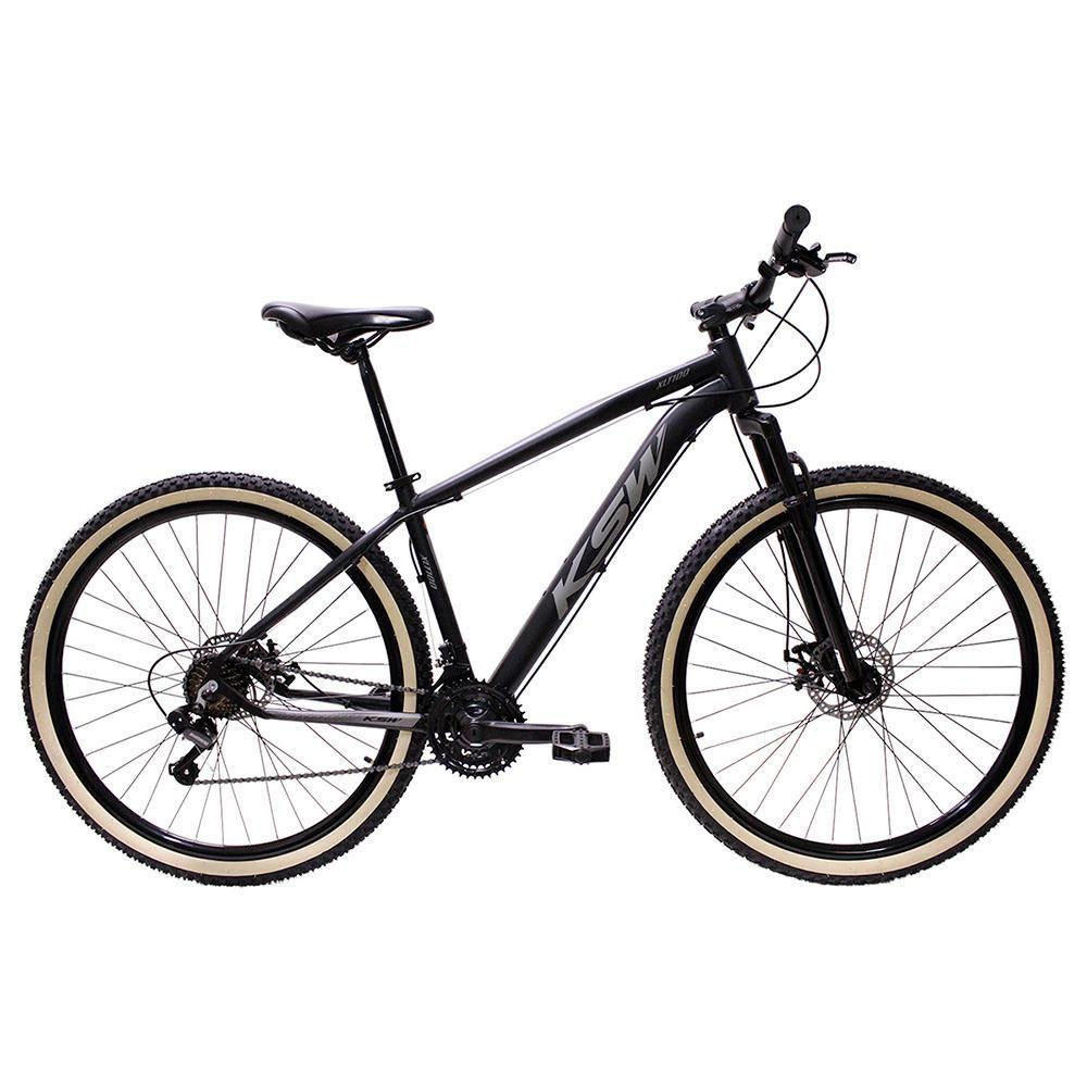 Bicicleta Aro 29 Ksw 21 Marchas Alumínio Cambio Shimano Preto Fos -ad PrataA Bicicleta KSW, é a escolha perfeita para os iniciantes do mountain bike, possuindo um dos melhores Custo-benefício do mercado, e com uma qualidade surpreendente.Dentre os atributos, os que mais se destacam são: Componentes em alumínio: Torna o produto mais leve. Freios a Disco: Frenagem segura e com baixo custo de Manutenção. Suspensão Dianteira: Amortecimento que Reduz impactos durante o trajeto. Além de trazer vários benefícios para a saúde, e para a Vida!Quadro 29 A6061 KSW XLT 100 Alumínio. Abraçadeira Quadro c/ Blocagem Alumínio. Suporte de Guidão Alumínio. Canote Selim sem Carrinho. Guidão Mtb Alumínio.Cambio Traseiro 7v Shimano. Cambio Dianteiro 3v Index. Alavancas Rapid Fire 21v Index.Freio a Disco Mecânico 160mm. Pedivela Aço Revestido Nylon 24/34/42D Index. Roda Livre 7v 14/28D Index. Corrente fina 7v Index.Garfo 29 Suspensão 100mm. Pneu 29 Mtb Multi-terreno Preto-Bege. Pedal Freestyle Nylon Inglês.Cubo em aço c/ Blocagem. Aros Aero Parede Dupla. Manopla Borracha Mtb.Movimento Central Roller Selim Mtb.Peso (Tam 17): 14,93kgRecomendações: Certifique-se do tamanho do quadro antes de efetuar a compra, recomendamos que escolha o tamanho de quadro de acordo com a altura do usuário, conforme tabela da última foto do anúncio.Montagem: A bicicleta vai montada e revisada, por motivo de acomodação na embalagem, são retirados selim, pedais, guidão e roda dianteira. A montagem final é de responsabilidade do cliente, sugerimos a mesma seja feita por uma oficina especializada (a empresa não se responsabiliza pela montagem e regulagem final da mercadoria).Garantia: 1 ano para o quadro e 3 meses para os componentes (ambos contra de fabricação). A garantia não cobre por mau uso ou pela montagem inadequada do produto. Imagem meramente ilustrativa. Marca: KSW | modelo: MTB | Suspensão: Dianteira | Aro: 29 | Marchas: 21 | Cor: PRETO FOS -AD PRATA