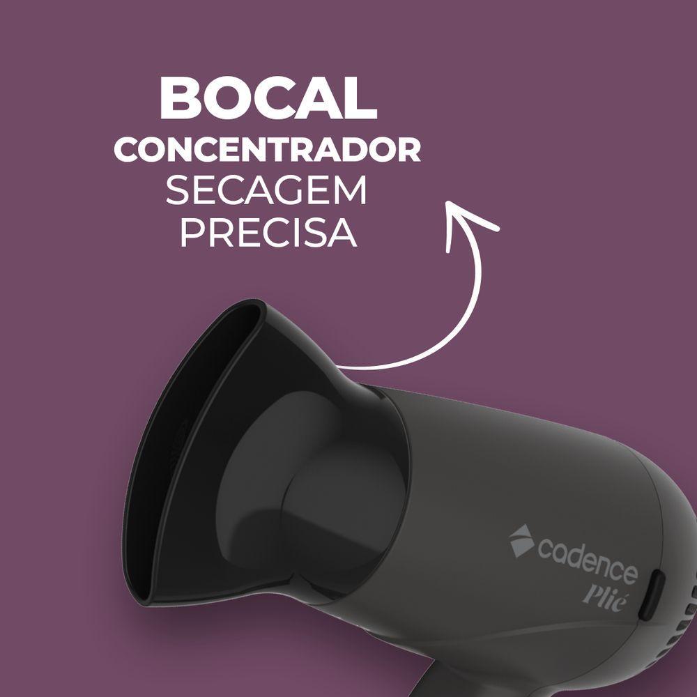 Secador De Cabelos Dobrável Cadence Plié BivoltO Secador de Cabelos Cadence Plié é leve, prático e ideal para o uso diário ou em viagens. Pesando apenas 300 gramas, oferece conforto e facilidade durante o manuseio, tornando a rotina de cuidados muito mais simples. Seu design dobrável garante fácil transporte e armazenamento, ocupando pouco espaço na bolsa, na mala ou em casa. Com bivolt automático, oferece praticidade para ser usado em qualquer lugar, sem a necessidade de se preocupar com a voltagem. Com potência de 1200W, proporciona secagem rápida com baixo consumo de energia, ideal para quem busca eficiência sem abrir mão da economia.O Secador Cadence Plié conta com 2 velocidades, permitindo ajustar o fluxo de ar conforme o tipo de cabelo, garantindo resultados personalizados e um acabamento perfeito. Possui cabo de 1,60 metro, oferecendo maior liberdade de movimento durante o uso. Acompanha bocal concentrador, que direciona o fluxo de ar para uma secagem mais precisa e eficiente, ideal para modelar e finalizar os fios com facilidade. Selo de Segurança Inmetro SGS.Potência de 1200WBivolt automáticoDesign dobrável: fácil transporte e armazenamento2 velocidades: se ajusta ao tipo de cabeloApenas 300g: leve e confortávelInformações Técnicas:Modelo: SEC190-BIVTensão: BivoltCódigo do Produto: SEC190Potência: 1200WConsumo: 1,2 kW/hDimensões (L x A x P): 155 x 190 x 68 mmGarantia: 12 mesesPeso: 0,29 kgCódigo de Barras: 7898742841141