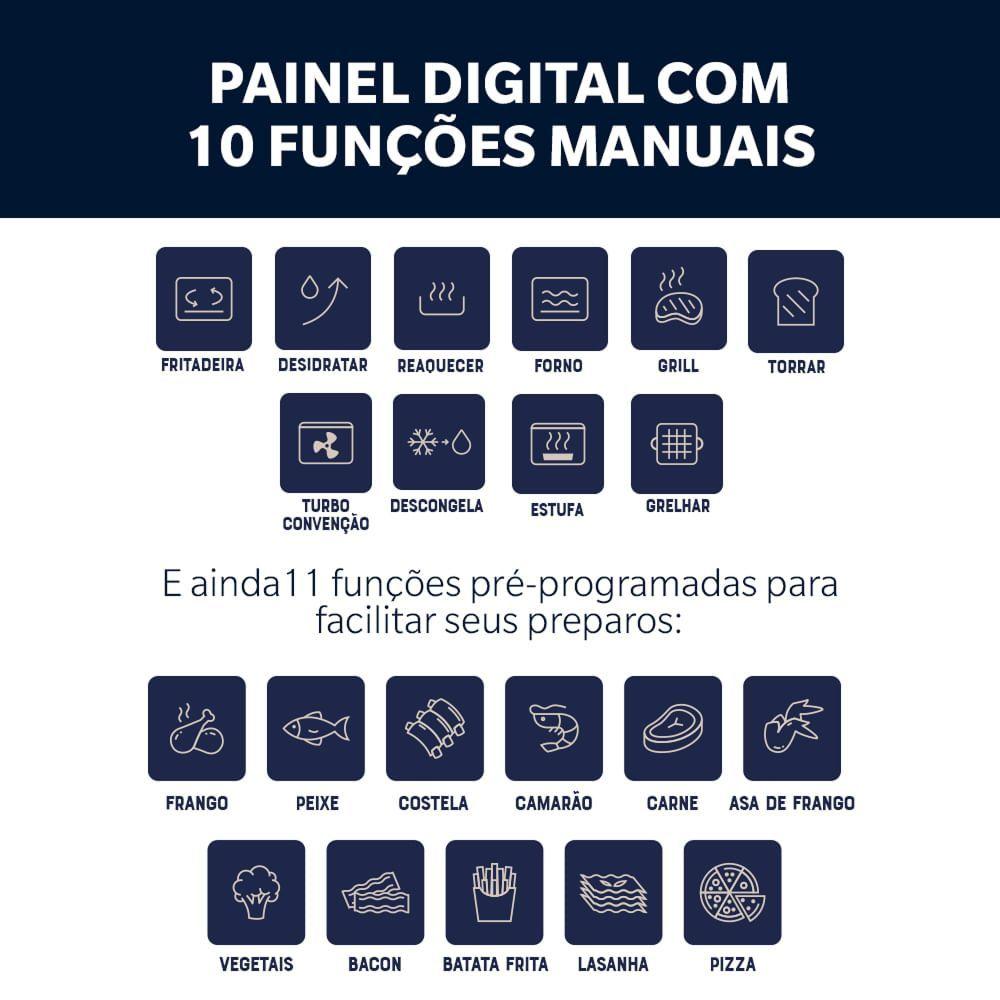 Forno E Fryer 15L Oster Multifunções Compact 10 Em 1 220VMuito mais praticidade para a sua rotina na cozinha. O Forno Fryer Multifunções Compact da Oster entrega tudo para quem quer sempre mais. São 21 funções e pré-programações que vão levar mais praticidade para a sua cozinha e saúde para a sua rotina.2 em 1 Forno e Fritadeira: Mais versatilidade e praticidade para seus momentos na cozinha. Com o novo Forno Fryer Multifunções Compact Oster, é possível fritar sem óleo e assar por convecção.10 Funções Manuais: Fritadeira, Grill, Desidratar, Descongela, Reaquecer, Forno, Grelhar, Turbo Convection, Torrar e Estufa.11 Funções Pré-Programadas: Frango, Peixe, Costela, Camarão, Carne, Asas de Frango, Vegetais, Bacon, Batata Frita, Lasanha e Pizza.Função Turbo Convecção: Mais velocidade na hora de assar. A função convecção garante que a temperatura seja igual por toda a superfície do alimento, proporcionando um cozimento uniforme e de melhor qualidade.1600W de Potência e Capacidade de 15L: Potência e capacidade na medida certa. Prepare todo tipo de receita na quantidade ideal para suas refeições.E Mais: Display digital e painel luminoso. Hack com 4 níveis. Controle de tempo e temperatura. Acabamento fosco. Acessórios: bandeja coletora de migalhas, assadeira e coletora de gordura, cesto de fritura, grelha e prateleira.Modelo: OFOR160-127 / OFOR160-220Tensão: 127V ou 220V (Não é Bivolt)Código Produto: OFOR160Potência: 1600 WConsumo: 1,6 kW/hDimensões [LxAxP]: 345x340x315mmGarantia (meses): 12 mesesPeso: 6,10KgCódigo de barras: 7898700219364 / 7898700219371Código de Barra [DUN-14]: 1 7898700219361 / 1 7898700219378Classificação Fiscal / NCM: 8516.60.00CEST: 21.047.00Medidas Embalagem Individual [LxAxP]: 413x390x348mmPeso Embalagem Individual [Kg]: 6,85KgMedidas Embalagem Master [LxAxP]: 425x408x365mmPeso Embalagem Master [Kg]: 7,5KgQtde. por Embalagem Master: 1Certificações: InmetroCódigo da Certificação: SGS