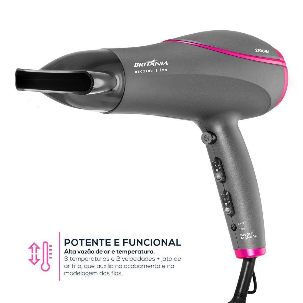 Secador De Cabelos Britânia 2100W BSC2200 BivoltO Secador de Cabelos Britânia Bivolt 2100W BSC2200 combina força, poder e durabilidade para garantir a melhor performance de uso. Sua versatilidade bivolt torna ele perfeito para levar a qualquer lugar, garantindo praticidade onde quer que você vá. Equipado com a tecnologia Tourmaline Íons, o Secador de Cabelos Britânia proporciona cabelos mais macios e brilhosos ao fechar as cutículas dos fios e reduzir o frizz, neutralizando a eletricidade estática natural dos cabelos.Com 3 temperaturas, 2 velocidades e jato de ar frio, oferece uma variedade de opções para diferentes tipos de cabelos, enquanto o jato de ar frio auxilia no acabamento e na modelagem dos fios. Seu acessório concentrador de ar possui uma saída fina que concentra e direciona o calor, facilitando a secagem e modelagem dos fios. Além disso, o cabo do Secador BSC2200 com 1,90m de comprimento proporciona praticidade, facilidade e maior liberdade de movimento durante o uso. Experimente o poder e a eficiência do Secador de Cabelos Britânia Bivolt 2100W BSC2200 e tenha cabelos deslumbrantes em qualquer lugar.Principais Características:- 3 temperaturas e 2 velocidades- Jato de ar frio- Modelo bivolt- Grade traseira removível- Cordão elétrico de 1,90m- Motor DCEspecificações Técnicas:Marca: BritâniaModelo: BSC2200Cor: CinzaPotência (W): 2100WComprimento do cordão elétrico (m): 1,9mConsumo (kW/h): 2,1Níveis de velocidade: 2Níveis de temperaturas: 3Características do Produto: Jato de Ar Frio Grade Traseira Removível Libera ÍonsAcessórios: ConcentradorAltura do produto: 25,5 cmLargura do produto: 22 cmComprimento do produto: 8,5 cmPeso do produto: 0,54 kgAltura com embalagem: 27,5 cmLargura com embalagem: 22,3 cmComprimento com embalagem: 9,5 cmPeso com embalagem: 0,69 kgGarantia (meses): 12Observação: Somente faturamos para o nosso consumidor final, ou seja, não faturamos pedidos para CNPJ por este portal de vendas;