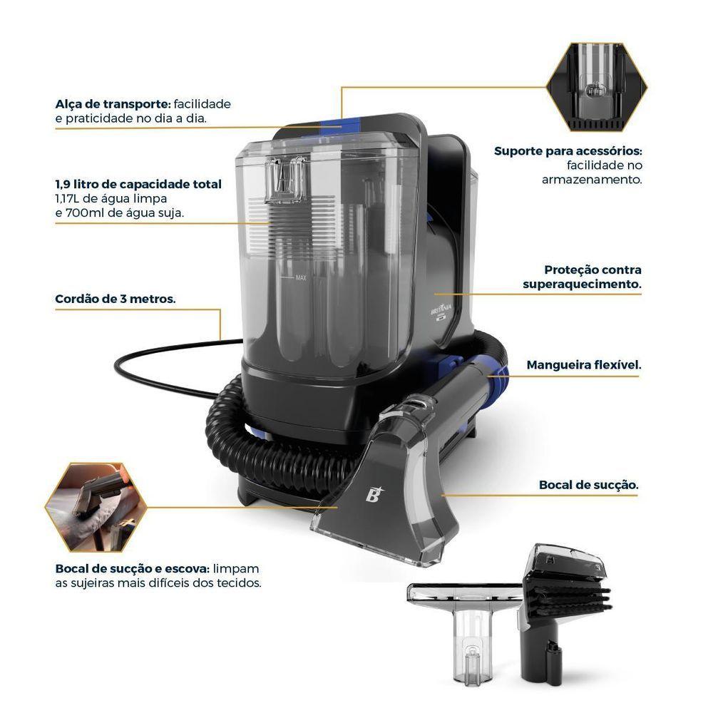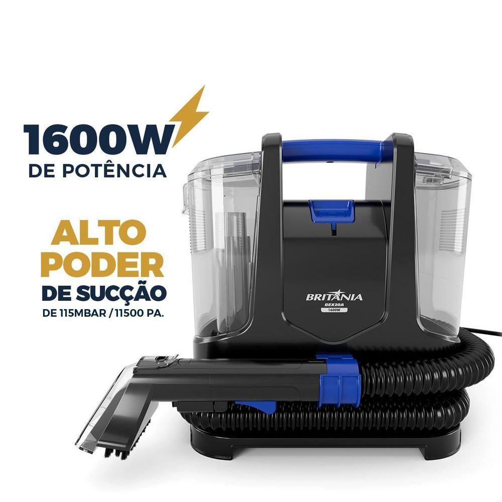 Extratora Portátil Britânia 1,9L 1600W BEX20A 110VSinta o prazer de ver sua casa renovada, com estofados, tapetes e sofás livres de manchas com a Extratora Portátil Britânia 1,9L 1600W BEX20A. A potente sucção de 115mbar/1150Pa elimina até a sujeira mais difícil. Com reservatório de 1,9L, você limpa mais sem interrupções.A potência de 1600W da sua Extratora Britânia garante uma limpeza rápida, eficiente e visivelmente superior. E com o cabo de 3 metros e mangueira de 1,4 metro, você alcança todos os cantos com facilidade. Depois, tudo fica organizado com o suporte de acessórios. A Extratora Portátil Britânia foi pensada para quem busca praticidade e conforto no dia a dia. Seu design ergonômico, compacto e fácil de manusear transforma qualquer limpeza em algo leve e ágil. Ideal para famílias que prezam por bem-estar.Não espere mais para elevar o padrão da sua rotina. Adquira agora a Extratora Portátil Britânia 1,9L 1600W BEX20A e descubra como a limpeza pode ser mais simples, eficaz e prazerosa.- Potência 1600- Acessórios: bocal com escova, bocal pequen- Indicador de reservatório chei- Mangueira de sucção de 1,4- Aspira líquido- Compartimento para guardar acessórios no corpo do produt- Capacidade do reservatório de água limpa: 1,17- Capacidade do reservatório de água suja: 0,7- Suporte para enrolar o cordã- Filtro Espum- Proteção contra superaqueciment- Alça para transporte.Especificações Técnicas:Marca: BritâniaModelo: BEX20AEstado: NovoCor: Preto e AzulAltura do produto: 30,9 cmLargura do produto: 29,5 cmComprimento do produto: 18 cmPeso do produto: 3,345 kgAltura com embalagem: 39,3 cmLargura com embalagem: 33,3 cmComprimento com embalagem: 21,7 cmPeso com embalagem: 4,29 kgGarantia (Dias): 360Observação: Somente faturamos para o nosso consumidor final, ou seja, não faturamos pedidos para CNPJ por este portal de vendas;