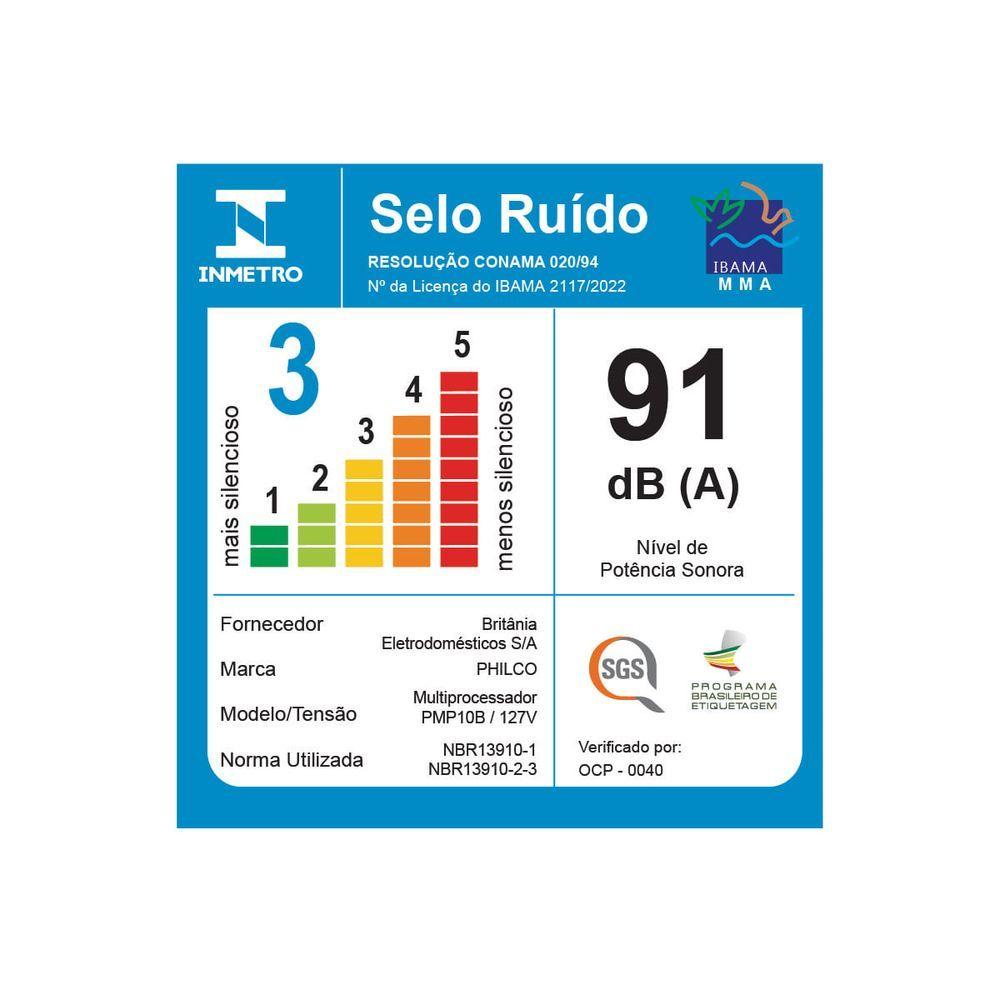 Multiprocessador Philco 1000W 5 Em 1 4 Lâminas Preto PMP10B 110VO Multiprocessador Philco 1000W 5 em 1 4 Lâminas Preto PMP10B foi desenvolvido para quem busca potência e versatilidade em um só produto. Com 1000W de potência e 12 velocidades ajustáveis, o Multiprocessador Philco garante desempenho superior para preparar desde sucos e cremes até massas e vegetais fatiados com precisão.A jarra de 1,5 litro e o processador com mesma capacidade permitem preparar grandes quantidades de forma prática, ideal para famílias ou quem gosta de se organizar com antecedência. As lâminas em aço inox do Multiprocessador PMP10B são resistentes e oferecem cortes uniformes nas funções de fatiar, ralar, liquidificar e emulsificar.Além de potente, o modelo traz base antiderrapante, trava de segurança e alojamento para o cordão, garantindo uso seguro e organizado. E pra facilitar ainda mais o dia a dia, seus acessórios podem ser lavados na lava-louças.Com o Multiprocessador Philco 1000W 5 em 1 4 Lâminas Preto PMP10B, você tem tecnologia, eficiência e segurança em um único equipamento. Um verdadeiro centro de preparo que transforma qualquer receita em uma experiência rápida, prática e deliciosa.Potência: 1000W12 velocidadesFunções: Liquidificador, Processador, Espremedor de Frutas, ralar e fatiarTipo de lâminas: 01 faca de liquidificador com 4 lâminas, 01 faca para processador, 01 lâmina de ralar e 01 lâmina de fatiarCapacidade total: 2,7 LCapacidade útil: 1,5 LCapacidade do recipiente do processador: 1,5 litrosBase antiderrapanteAlojamento do cordãoPode ser levada a lava-louçasLâminas em Aço inoxTrava de segurança.Especificações Técnicas:Marca: PhilcoModelo: PMP10BEstado: NovoPossui trava de segurança: SimFuncionamento: O aparelho só funciona com a jarra/copo encaixados na posição corretaCor: PretoAltura do produto: 43,9 cmLargura do produto: 26,5 cmComprimento do produto: 26,5 cmPeso do produto: 2,873 kgAltura com embalagem: 36 cmLargura com embalagem: 45,1 cmComprimento com embalagem: 23,6 cmPeso com embalagem: 3,345 kgGarantia (Dias): 360Observações: Somente faturamos para o nosso consumidor final, ou seja, não faturamos pedidos para CNPJ por este portal de vendas;