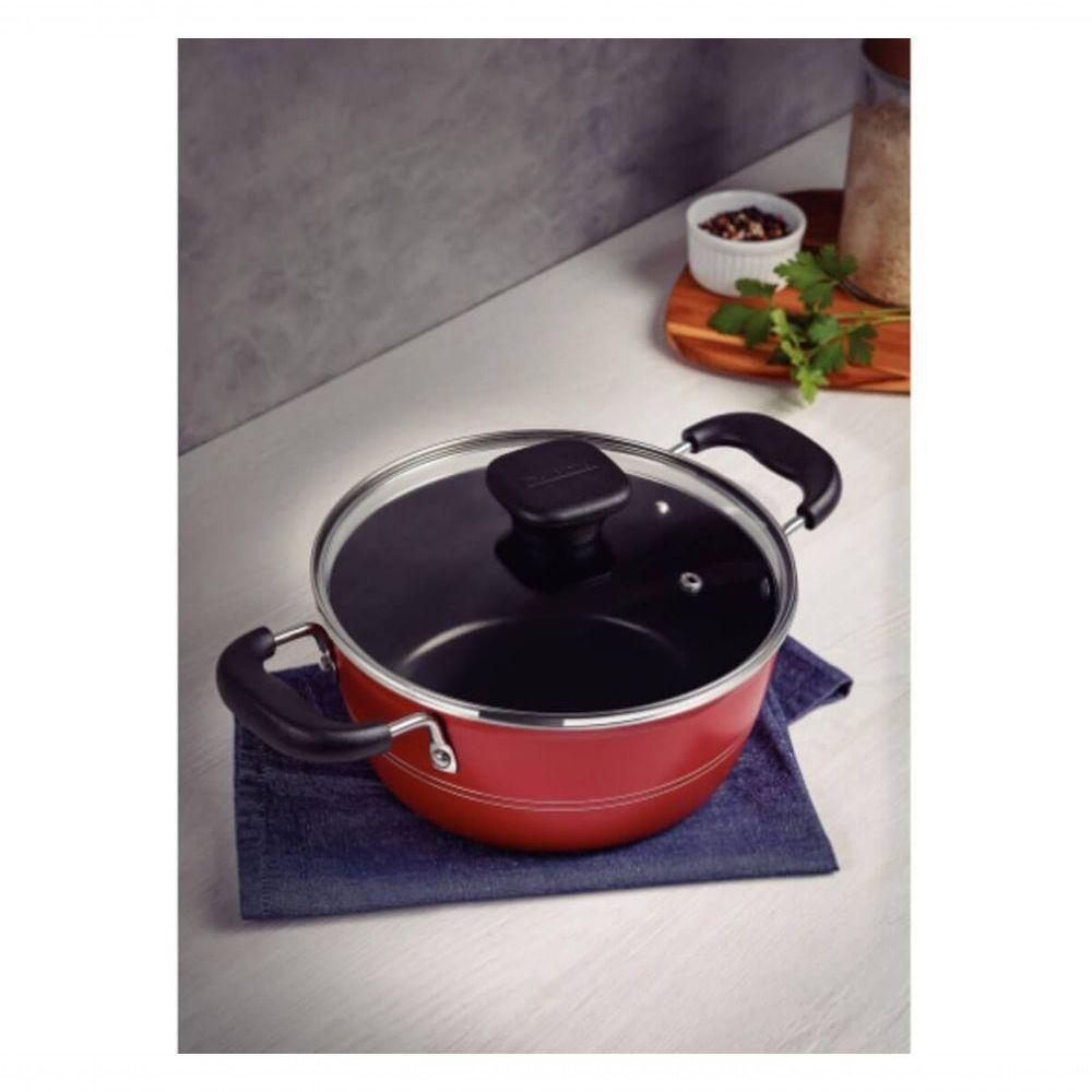 Caçarola Tramontina Sicília Antiaderente Vermelho 24cm A caçarola Tramontina Sicília em alumínio com revestimento interno e externo em antiaderente Starflon Excellent vermelho 24 centímetros de diâmetro 4,3 litros é a escolha perfeita para uso diário e para completar sua cozinha com muito mais cor e estilo. Produzida em alumínio com revestimento antiaderente Starflon Excellent, ela irá garantir maior praticidade e funcionalidade para seu dia a dia, pois os alimentos cozinham de maneira uniforme e não grudam em sua superfície. Suas alças são em baquelite antitérmico e proporcionam um manuseio muito mais confortável e , pois não aquecem. Ela ainda é muito fácil de limpar e pode ser levada à máquina de louças, facilitando suas tarefas e poupando seu tempo na cozinha. A escolha ideal para levar o melhor para sua casa!Recomendações de Uso:Antes do Primeiro Uso: Lave com esponja macia, sabão neutro ou detergente líquido. Depois de secar, unte a área interna com óleo ou gordura e leve ao fogo por um ou dois minutos. Deixe esfriar e lave novamente. Seu utensílio Starflon está pronto para uso com ou sem gordura, sempre em fogo baixo ou médio (nunca superior a 260ºC).Modo de Uso: Posicione as alças do utensílio voltado ao centro do fogão. Em fogões com grade, centralize a peça e alinhe as alças com a grade. ;Para mexer os alimentos use somente utensílios de silicone, nylon ou madeira. Evite a imersão do utensílio quente em água fria. Nunca utilize produtos abrasivos na lavagem. Se deixar queimar alimentos, umedeça a área e reserve até que possa remover os resíduos grudados com esponja e sabão. Para descarte do produto e embalagem siga as orientações de reciclagem vigentes. Este produto não necessita de manutenção, apenas limpeza.Informações Adicionais:- Corpo de alumínio:- Espessura de 3,0 mm; ;- Pode ir à máquina de lavar louças;- Alças e pegador de baquelite antitérmicos;- Tampa de vidro temperado, com saída de vapor e borda de aço inox;- Revestimento interno e externo de antiaderente Starflon Excellent ;livre de PFOA;- A capacidade volumétrica máxima para cozimento é de 3/4 da capacidade total da peça. ;- Foto meramente ilustrativa.