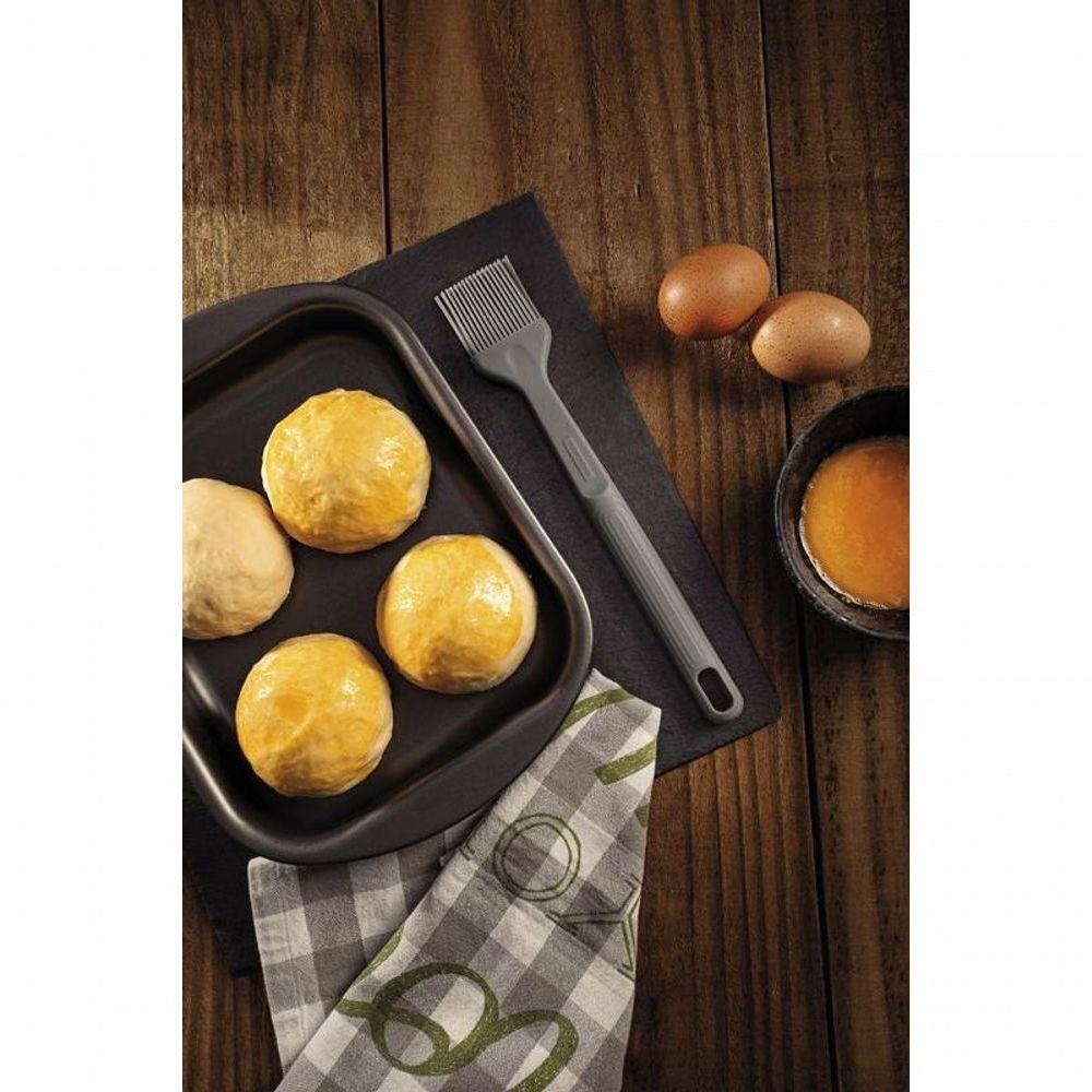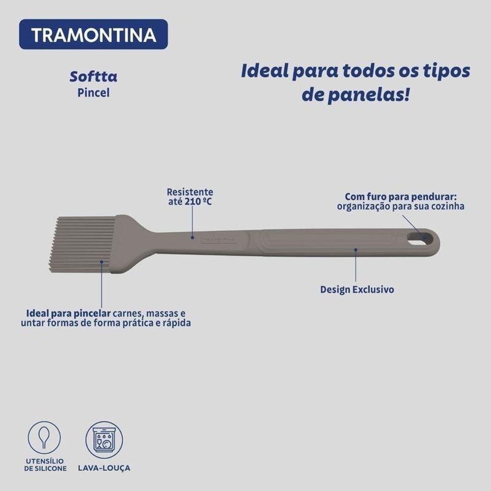 Pincel De Silicone Tramotina Softta CinzaO pincel Tramontina Softta em silicone cinza é perfeito para quem valoriza controle e agilidade na hora de cozinhar. Suas cerdas resistentes ao calor suportam até 210 °C, ideais para pincelar assados sem comprometer superfícies sensíveis como cerâmicas e antiaderentes. O cabo com formato ergonômico garante firmeza e conforto no uso, enquanto o tom cinza discreto traz um toque moderno à cozinha. Prático, fácil de limpar e pensado para o dia a dia, ele une eficiência e cuidado em cada detalhe.Recomendações de Uso:Modo de Uso: ;Antes da primeira utilização, lave bem a peça e seque-a. Não utilizar esponja abrasiva para limpeza e para maior durabilidade do produto recomenda-se secar bem antes de guardar, mesmo após lavagem em máquina. O produto pode sofrer alterações no aspecto visual ao longo do uso, em virtude da pigmentação dos alimentos e degradação natural da cor do utensílio. Não deixar o utensílio em superfícies quentes por tempo prolongado. Não armazenar o utensílio junto a materiais cortantes e perfurantes. Para descarte do produto e embalagem siga as orientações de reciclagem vigentes.- Foto meramente ilustrativa.Informações Adicionais:- Pode ir à máquina de lavar louças facilitando seu dia a dia;- Pincel de silicone, que resiste até uma temperatura de 210 °C;- Cabo com furo passante possibilitando que seja pendurado na sua cozinha;- Utensílio ideal para uso em panelas com revestimentos antiaderentes e cerâmicos, pois não danifica o produto.