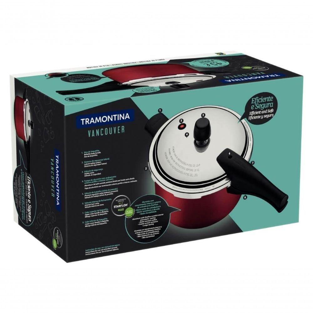 Panela Pressão Tramontina Vancouver Antiaderente 20cm 4,5l VermelhoJá pensou em ter em sua cozinha uma panela de pressão eficiente, segura e resistente, que além de colorida e linda, também, não grude os alimentos? Pois, a panela de pressão Tramontina Vancouver em alumínio com revestimento interno e externo antiaderente Starflon Max vermelho 20 centímetros de diâmetro 4,5 litros é tudo isso e muito mais! Com um lindo revestimento interno e externo em antiaderente Starflon Max na cor vermelha, ela será a estrela do seu fogão. Ela é produzida em alumínio com espessura que proporciona o cozimento rápido e uniforme dos alimentos e vem na vibrante cor vermelha. É uma panela que possui alça e cabos antitérmicos para facilitar o manuseio e conta com três válvulas de que oferecem maior proteção durante o uso. Com certeza, a escolha perfeita para completar seu ambiente e ser a protagonista em sua cozinha!Recomendações de Uso:Antes do uso: remova eventuais etiquetas, lave interna e externamente o utensílio, usando apenas uma esponja macia, sabão neutro ou detergente líquido. Outros tipos de produtos, como palha de aço, poderão riscar ou prejudicar a peça. Depois de secar, unte a área interna com óleo ou gordura, e leve a panela destampada ao fogo em temperatura baixa por 01 ou 02 minutos. Deixe esfriar, lave e enxugue novamente. A partir daí poderá ser com ou sem de uso: evite esquentar o utensílio vazio. A panela nunca deve funcionar sem água, pois poderá danificar o anel de silicone e as válvulas de . Nunca ultrapasse os níveis de água indicados internamente na panela. Use sempre aquecimento baixo ou médio para reter o valor nutritivo dos alimentos e conservar o revestimento do utensílio (nunca superior a 350°). Evite que as chamas atinjam as laterais do utensílio. Não bata com utensílios de cozinha na borda da panela de pressão, pois isto poderá prejudicar a perfeita vedação da mesma. Nunca abra a panela de pressão sem antes liberar toda a pressão armazenada na panela a fim de evitar acidentes. Ao retirar a panela do fogo, não force a tampa para abrir. Verifique a pressão interna levantando a válvula de trabalho. Para mexer ou retirar o alimento, utilize somente utensílios de madeira, nylon ou silicone, que não danificam a superfície com antiaderente. Nunca corte alimentos diretamente no revestimento antiaderente. Ao manusear seu utensílio aquecido, cuide para não arranhar/riscar o revestimento externo. Evite escorrer gordura nas partes externas da peça, pois em com o fogo pode causar ós o uso: deixe o utensílio esfriar antes de lavar. Evite imersão do utensílio quente em água fria. Se deixar queimar alimentos, umedeça a área e reserve até que possa remover os resíduos grudados com esponja e sabão. Mesmo depois de vários usos, nunca utilize produtos abrasivos na lavagem. Retire o anel de vedação e lave-o separadamente. Após cada uso, retire a válvula de trabalho e verifique se os orifícios estão desobstruídos. No caso de alimentos ácidos, muito alcalinos ou resíduos de alimentos aderidos na parede da panela, lave com água quente misturada com detergente neutro.- Foto meramente ilustrativa.Informações Adicionais:- Corpo de alumínio com espessura de 3,2 mm;- Com revestimento interno e externo de antiaderente Starflon Max;- Tampa de alumínio com acabamento externo polido e interno satinado;- Alça, cabos superior e inferior de baquelite antitérmico que oferecem durante o manuseio.- Foto meramente ilustrativa.