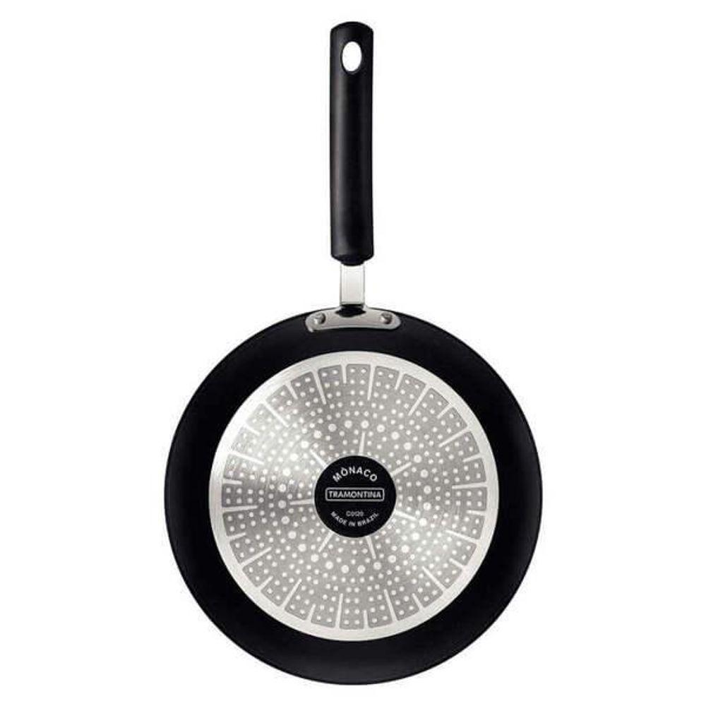 Frigideira Tramontina Mônaco Induction Com Revestimento Interno E Externo Antiaderente Starflon Premium Preto 26cmA Frigideira Tramontina Mônaco Induction em Alumínio com Revestimento Interno e Externo Antiaderente Starflon Premium Preto 26 cm de diâmetro 2 L você irá garantir o melhor utensílio para o sucesso das suas receitas! Produzida em alumínio com revestimento antiaderente Starflon Premium, ela não gruda os alimentos, é mais durável e não é prejudicial à sua saúde. O cabo é metálico com proteção de silicone e reduz a propagação de calor, aumentando a e melhorando seu manuseio. Ela ainda é muito fácil de limpar e pode ir à máquina de lavar louças. A escolha perfeita para garantir o cozimento dos seus alimentos de maneira e uniforme!Recomendações de Uso:A capacidade volumétrica máxima para cozimento é de 3/4 da capacidade total da peça. Posicione os cabos dos utensílios voltados ao centro do fogã fogões com grade, centralize a peça e alinhe o cabo com a grade. Utensílios quentes devem estar fora do alcance das crianç produto não pode sofrer modificações. Antes do primeiro uso, lave com esponja macia, sabão neutro ou detergente líquido. Depois de secar, unte a área interna com óleo ou gordura e leve ao fogo por um ou dois minutos. Deixe esfriar e lave novamente. Seu utensílio Starflon está pronto para uso com ou sem gordura, sempre em fogo baixo ou médio (nunca superior a 350ºC).Para mexer os alimentos use somente utensílios de silicone, nylon ou madeira. Evite a imersão do utensílio quente em água fria. Nunca utilize produtos abrasivos na lavagem. Se deixar queimar alimentos, umedeça a área e reserve até que possa remover os resíduos grudados com esponja e sabã descarte dos produtos e embalagens siga as orientações de reciclagem vigentes. Este produto não necessita de manutenção, apenas limpeza.Informações Adicionais:Corpo de alumínio com espessura de 3,0 mm que proporciona cozimento rápido e uniforme. Revestimento interno e externo de antiaderente Starflon Premium que não gruda, é fácil de limpar, mais durável e não é prejudicial a saú metálico com proteção de silicone que proporciona redução da propagação de calor, aumentando a e melhorando a empunhadura. Pode ir à máquina de lavar louças facilitando seu dia a dia.