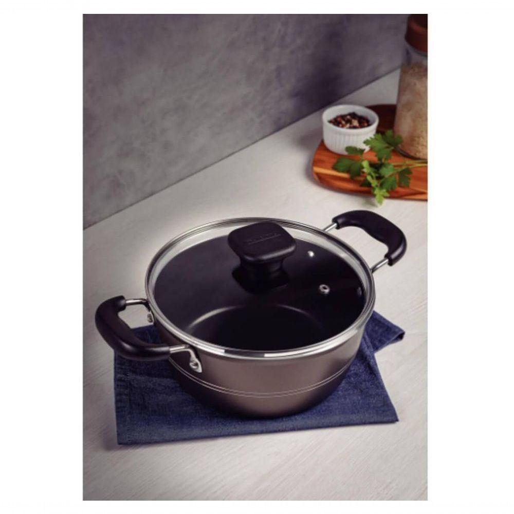 Caçarola Tramontina Sicília Antiaderente Avelã 24cm A caçarola Tramontina Sicília em alumínio com revestimento interno e externo em antiaderente Starflon Excellent avelã 24 centímetros de diâmetro 4,3 litros é indispensável para preparar suas receitas do dia a dia. Produzida com corpo em alumínio e revestimento interno e externo de antiaderente Starflon Excellent, ela proporciona o cozimento dos alimentos de maneira rápida e uniforme, evita que eles grudem em sua superfície, a tornam fácil de limpar, mais durável e não prejudicial a saúde. Suas alças são em baquelite antitérmico e oferecem maior durante o manuseio, pois não aquecem. Ela ainda pode ir à máquina de lavar louças e vai completar sua cozinha com muito mais estilo!Recomendações de Uso:Antes do Primeiro Uso: Lave com esponja macia, sabão neutro ou detergente líquido. Depois de secar, unte a área interna com óleo ou gordura e leve ao fogo por um ou dois minutos. Deixe esfriar e lave novamente. Seu utensílio Starflon está pronto para uso com ou sem gordura, sempre em fogo baixo ou médio (nunca superior a 260ºC).Modo de Uso: Posicione as alças do utensílio voltado ao centro do fogão. Em fogões com grade, centralize a peça e alinhe as alças com a grade. ;Para mexer os alimentos use somente utensílios de silicone, nylon ou madeira. Evite a imersão do utensílio quente em água fria. Nunca utilize produtos abrasivos na lavagem. Se deixar queimar alimentos, umedeça a área e reserve até que possa remover os resíduos grudados com esponja e sabão. Para descarte do produto e embalagem siga as orientações de reciclagem vigentes. Este produto não necessita de manutenção, apenas limpeza.Informações Adicionais:- Corpo de alumínio:- Espessura de 3,0 mm; ;- Pode ir à máquina de lavar louças;- Alças e pegador de baquelite antitérmicos;- Tampa de vidro temperado, com saída de vapor e borda de aço inox;- Revestimento interno e externo de antiaderente Starflon Excellent ;livre de PFOA;- A capacidade volumétrica máxima para cozimento é de 3/4 da capacidade total da peça. ;- Foto meramente ilustrativa.