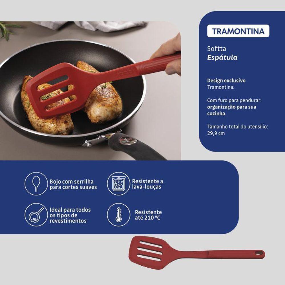 Espátula Tramontina Softta Vazada Em Silicone VermelhoCuidar dos detalhes faz toda a diferença na hora de cozinhar. A espátula vazada Tramontina Softta em silicone vermelho é ideal para quem precisa de um utensílio leve, resistente e gentil com as panelas. Seu formato vazado ajuda a escorrer líquidos com facilidade, enquanto o silicone, que suporta até 210 °C, evita danos às superfícies antiaderentes. O cabo ergonômico proporciona conforto no manuseio, e a limpeza é descomplicada: pode ir direto à lava-louça. Com cor vibrante e acabamento moderno, ela leva mais praticidade e charme à rotina da cozinha.Recomendações de Uso:Modo de uso: Antes da primeira utilização, lave bem a peça e seque-a. Não utilizar esponja abrasiva para limpeza e para maior durabilidade do produto recomenda-se secar bem antes de guardar, mesmo após lavagem em máquina. O produto pode sofrer alterações no aspecto visual ao longo do uso, em virtude da pigmentação dos alimentos e degradação natural da cor do utensílio. Não deixar o utensílio em superfícies quentes por tempo prolongado. Não armazenar o utensílio junto a materiais cortantes e perfurantes. Para descarte do produto e embalagem siga as orientações de reciclagem vigentes.- Foto meramente ilustrativa.Informações Adicionais:- Pode ir à máquina de lavar louças facilitando seu dia a dia; - Espátula de silicone, que resiste até uma temperatura de 210 °C; - Com furo passante no cabo possibilitando que seja pendurado na sua cozinha; - Utensílio ideal para uso em panelas com revestimentos antiaderentes e cerâmicos, pois não danifica o produto.