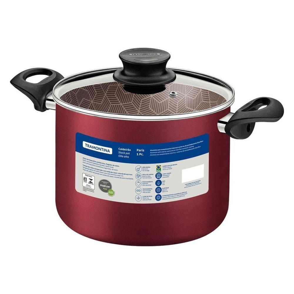 Caldeirão Tramontina Paris 28cm Em Alumínio Com Revestimento Antiaderente Vermelho E Tampa De VidroO caldeirão Tramontina Paris em alumínio com revestimento interno e externo em antiaderente Starflon Max vermelho com tampa de vidro 28 centímetros 11,8 litros vai permitir que você prepare aquela feijoada deliciosa para seus amigos e para sua família. Ele é produzido em alumínio com espessura de 1,8 milímetros e conta com revestimento interno e externo de antiaderente Starflon Max, duas características que proporcionam um cozimento rápido e uniforme dos alimentos, evitam que eles grudem em sua superfície e o tornam superfácil de limpar. Para proporcionar maior , as alças em baquelite antitérmico e o pegador em nylon da tampa de vidro temperado não aquecem e ainda garantem um manuseio muito mais confortável. O caldeirão ainda é muito fácil de limpar e vai garantir funcionalidade e versatilidade para sua cozinha!Recomendações de Uso:Antes do Uso: Lave com esponja macia, sabão neutro ou detergente líquido. Depois de secar, unte a área interna com óleo ou gordura e leve ao fogo por um ou dois minutos. Deixe esfriar e lave novamente. Seu utensílio Starflon está pronto para uso com ou sem gordura, sempre em fogo baixo ou médio (nunca superior a 260 °C). Para mexer os alimentos use somente utensílios de silicone, nylon ou madeira. Com o uso, as alças e o pegador podem afrouxar devido à dilatação normal dos materiais. Reaperte apenas o suficiente, sem forçar. Limpeza: Evite a imersão do utensílio quente em água fria. Nunca utilize produtos abrasivos na lavagem. Se deixar queimar alimentos, umedeça a área e reserve até que possa remover os resíduos grudados com esponja e sabão. Para descarte do produto e embalagem siga as orientações de reciclagem vigentes.- Foto meramente ilustrativa.Informações Adicionais:- Pode ir à máquina de lavar louças facilitando seu dia a dia;- Tampa de vidro temperado, com saída de vapor e borda de aço inox;- Revestimento interno e externo de antiaderente Starflon Max livre de PFOA;- A capacidade volumétrica máxima para cozimento é de 3/4 da capacidade total da peça;- Alças de baquelite antitérmico e pegador de nylon que oferecem durante o manuseio. ;