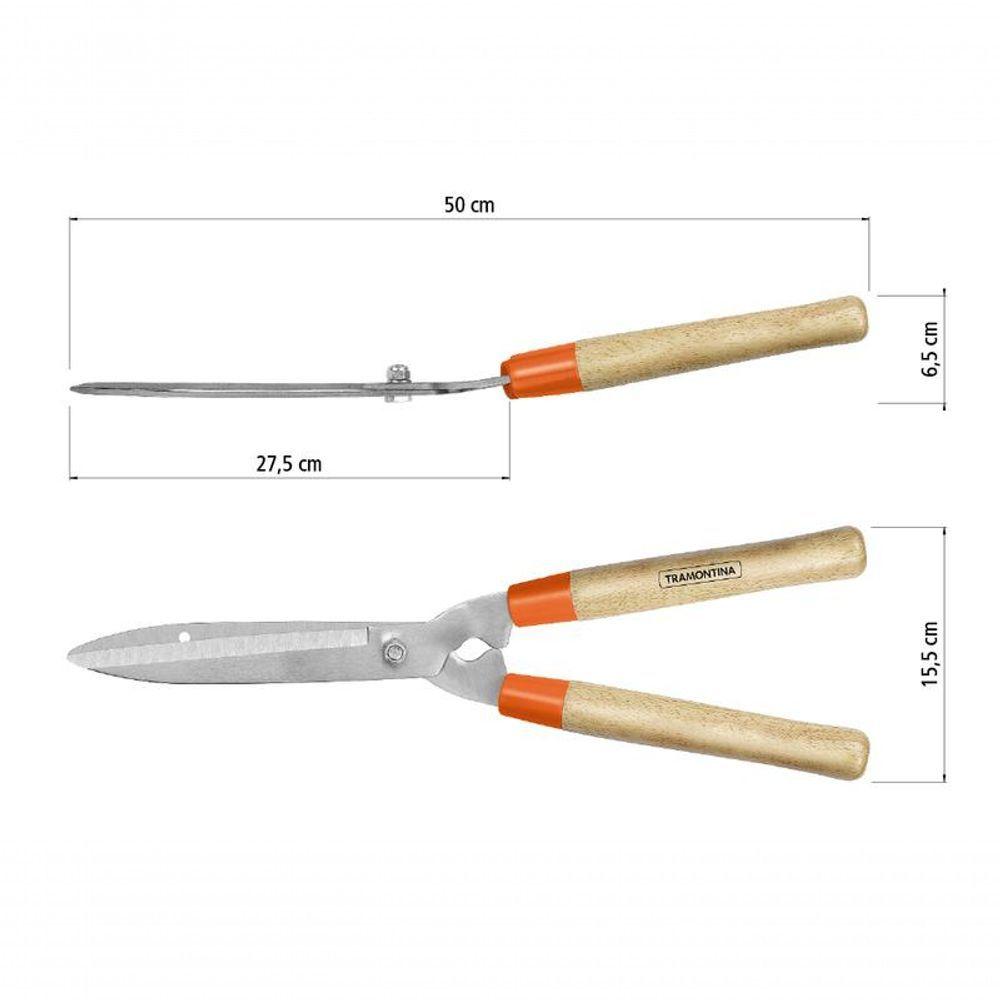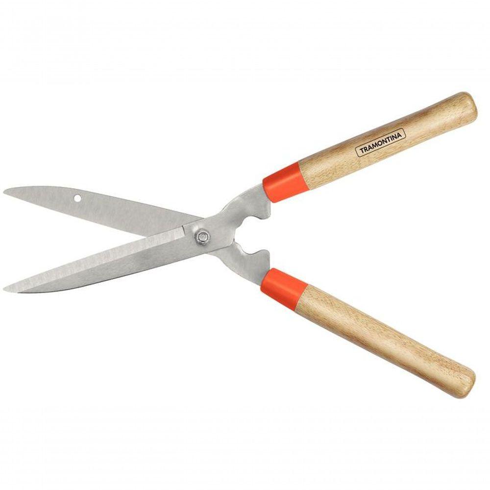 Tesoura Para Cerca Viva E Grama Tramontina Com Em Aço Cabos De MadeiraPara manter seu jardim impecável, conte com a tesoura para cerca viva e grama Tramontina com lâminas metálicas e cabos de madeira. Ela permite aparar arbustos, finalizar detalhes na grama e trabalhar nos cantinhos que fazem toda a diferença na estética do seu jardim. Além disso, é ideal para quem gosta de topiaria, possibilitando criar diferentes formas e acabamentos com precisão e praticidade.Recomendações de Uso:Modo de uso: Própria para desbaste e acabamento de cerca viva, arbustos e para aparar a grama. Também pode ser utilizada na topiaria (arte de podar plantas em formas ornamentais). ;Conservar a ferramenta limpa, secando-a depois de lavá-la. Aplique fina camada de óleo sobre as lâminas e articulações. A lâmina é afiada, o ; pode resultar em lesões. Manuseie com cuidado e mantenha fora de alcançe das crianças. Para descarte dos produtos e embalagens siga as orientações de reciclagem vigentes.- Foto meramente ilustrativa.Informações Adicionais:- Entalhe na lâmina para cortar pequenos galhos;- A guarnição metálica protege o cabo contra rachaduras e desgastes;- Lâminas lisas fabricadas em aço carbono especial de alta qualidade;- O cabo desta ferramenta, além de possuir ótima resistência, é produzido com madeira de origem renovável;- A tesoura é temperada em todo o corpo da peça, proporcionando maior resistência e menor desgaste durante o uso;- A afiação das lâminas é feita em máquinas CNC, proporcionando excelente durabilidade do fio e um corte mais preciso e macio;- Cabo com acabamento envernizado, para um melhor acabamento e apresentação do produto. A camada protetora em verniz incolor realça sua tonalidade, concedendo brilho e um toque mais liso ao produto.