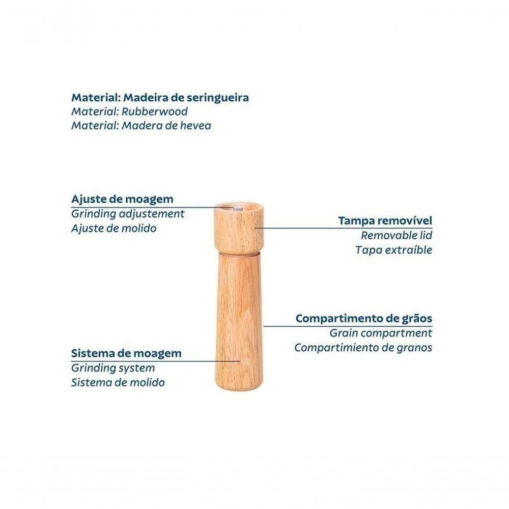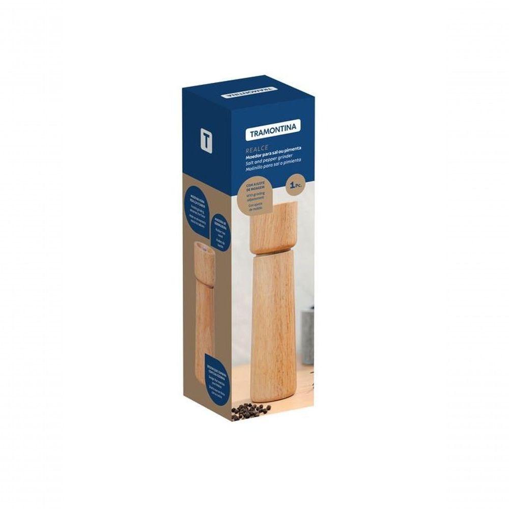 Moedor De Sal E Pimenta Tramontina Realce 20,5cm Em Madeira SeringueiraCom 20,5 cm, o moedor de sal e pimenta Tramontina Realce em madeira de seringueira une praticidade e presença à mesa. Capaz de armazenar até 65 g de sal grosso ou 25 g de pimenta, permite ajustar a moagem conforme a textura desejada, oferecendo mais controle no preparo dos alimentos. A estrutura em madeira natural traz um toque acolhedor e sofisticado, ideal para quem valoriza beleza e cuidado nos detalhes ao temperar cada receita.Recomendações de Uso:Modo de Uso: ;Uso seguro e adequado: Tenha cuidado ao manusear o produto, poderá quebrar ao sofrer quedas ou impactos. Ao usar o moedor com sal em ambientes muito úmidos, ele poderá não funcionar adequadamente; recomendamos trocar ou secar o sal. Não lavar o moedor; para limpeza, use um pano úmido na parte externa. Para descarte dos produtos e embalagens, siga as orientações de reciclagem vigentes. Tampa removível Compartimento de grãos Sistema de moagem Ajuste de moagem Para regular o tamanho do grão: Com uma das mãos segure o compartimento de grãos e com a outra gire/desrosqueie o suporte de regulagem. Para uma moagem fina, gire o suporte de regulagem no sentido horário. Para uma moagem mais grossa, gire o suporte de regulagem no sentido anti-horário. Para abastecer: Retire a tampa do compartimento de grãos, removendo totalmente o suporte de regulagem, girando-o no sentido anti-horário, e puxe a tampa. Após isso, adicione o grão a ser moído. Para moer: Com o moedor na posição correta, segure o compartimento de grãos com uma das mãos e com a outra gire a tampa no sentido horário, para moer o tempero. Atenção: Certifique-se de girar a tampa no sentido horário ao moer, para evitar possíveis danos. Se o moedor ficar preso durante o uso, agite suavemente o moinho de sal/pimenta, pois às vezes algum grão pode entupir o moedor, se você forçar o uso, talvez possa quebrar o moedor. Se o problema persistir, vire o moedor ao contrário, girando-o duas ou três vezes para que o grão preso no moedor volte para o compartimento e libere sua regulagem.- Foto meramente ilustrativa.Informações Adicionais:- Capacidade para sal de 65 gramas e pimenta de 25 gramas;- Possui engrenagem de alta resistência, proporcionando maior durabilidade;- Moedor em madeira seringueira com pino regulador de tamanho de grão, para que seja ajustado conforme seu gosto.