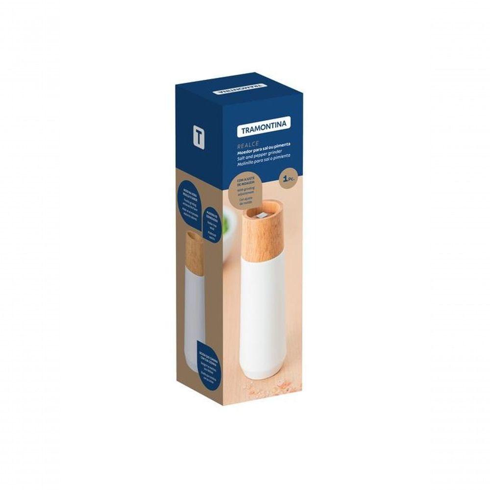 Moedor Tramontina De Sal E Pimenta Realce 19,7cm Branco Em Madeira Seringueira Para quem valoriza praticidade no dia a dia e cuidado nos detalhes, o moedor de sal e pimenta Tramontina Realce em madeira de seringueira branca, com 19,7 cm, é uma excelente escolha. Ele comporta até 60 g de sal grosso ou 25 g de pimenta e permite ajustar a moagem conforme o tamanho do grão desejado. Suas engrenagens resistentes asseguram um desempenho eficiente por mais tempo. O acabamento branco adiciona leveza e charme à composição, harmonizando com diferentes estilos de cozinha e mesa.Recomendações de Uso:Modo de Uso: ;Uso seguro e adequado: Tenha cuidado ao manusear o produto, poderá quebrar ao sofrer quedas ou impactos. Ao usar o moedor com sal em ambientes muito úmidos, ele poderá não funcionar adequadamente; recomendamos trocar ou secar o sal. Não lavar o moedor; para limpeza, use um pano úmido na parte externa. Para descarte dos produtos e embalagens, siga as orientações de reciclagem vigentes. Tampa removível Compartimento de grãos Sistema de moagem Ajuste de moagem Para regular o tamanho do grão: Com uma das mãos segure o compartimento de grãos e com a outra gire/desrosqueie o suporte de regulagem. Para uma moagem fina, gire o suporte de regulagem no sentido horário. Para uma moagem mais grossa, gire o suporte de regulagem no sentido anti-horário. Para abastecer: Retire a tampa do compartimento de grãos, removendo totalmente o suporte de regulagem, girando-o no sentido anti-horário, e puxe a tampa. Após isso, adicione o grão a ser moído. Para moer: Com o moedor na posição correta, segure o compartimento de grãos com uma das mãos e com a outra gire a tampa no sentido horário, para moer o tempero. Atenção: Certifique-se de girar a tampa no sentido horário ao moer, para evitar possíveis danos. Se o moedor ficar preso durante o uso, agite suavemente o moinho de sal/pimenta, pois às vezes algum grão pode entupir o moedor, se você forçar o uso, talvez possa quebrar o moedor. Se o problema persistir, vire o moedor ao contrário, girando-o duas ou três vezes para que o grão preso no moedor volte para o compartimento e libere sua regulagem.- Foto meramemte ilustrativa.Informações Adicionais:- Capacidade para sal de 60 gramas e pimenta de 25 gramas;- Possui engrenagem de alta resistência, proporcionando maior durabilidade;- Moedor em madeira seringueira com pino regulador de tamanho de grão, para que seja ajustado conforme seu gosto.