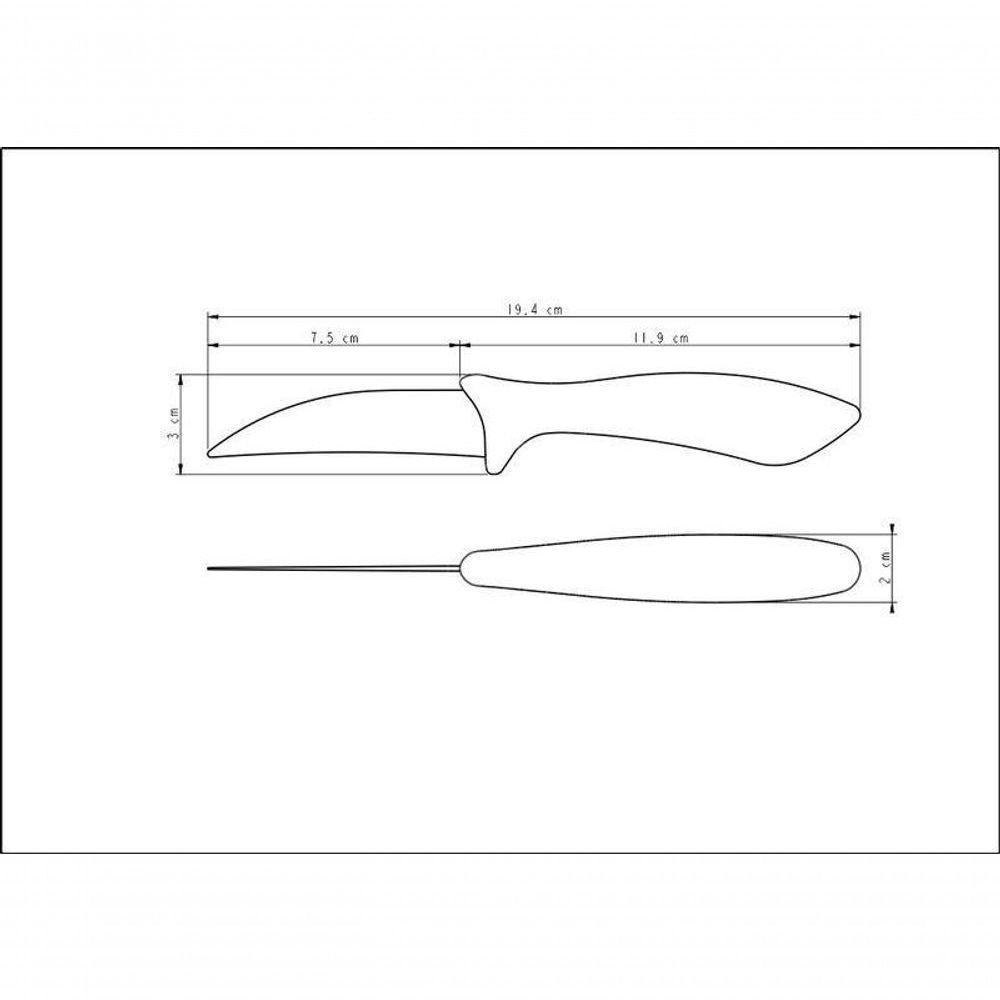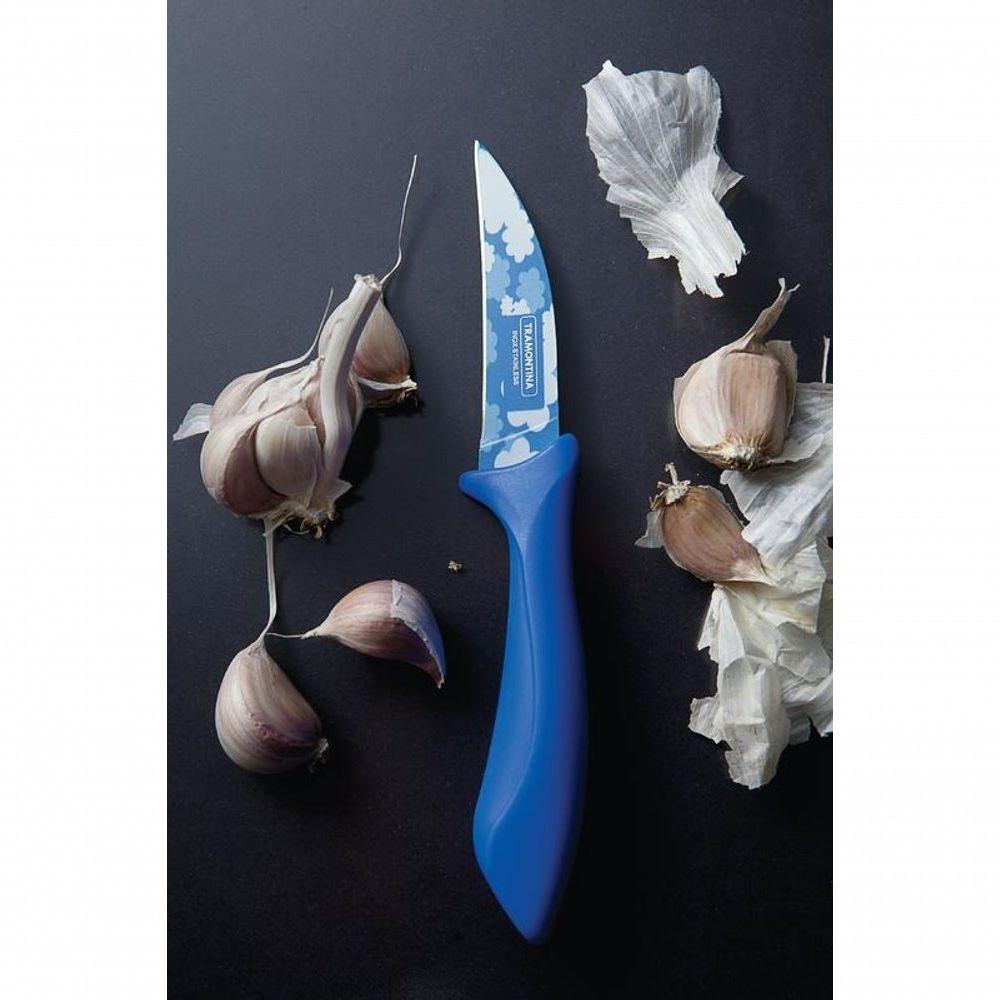 Faca Para Tornear Tramontina Azul Com Lâmina Em Inox E Cabo De Polipropileno Colorcut 3A Faca para Tornear Tramontina Colorcut com Lâmina em Aço Inox e Cabo de Polipropileno Azul 3 polegadas é a escolha certa para quem busca praticidade e um toque de cor na cozinha. Ideal para preparar frutas, legumes e verduras com precisão, ela possui lâmina em aço inox altamente durável e afiada, garantindo cortes perfeitos. Seu cabo em polipropileno azul é ergonômico, oferecendo conforto durante o uso, além de contar com proteção antimicrobiana que inibe o crescimento de fungos e bactérias. Com a linha Colorcut, suas receitas ganham mais leveza, eficiência e um visual cheio de estilo!Recomendações de Uso:Modo de uso: ;Tenha cuidado ao manusear produtos cortantes e perfurantes e mantenha-os fora do alcance das crianças. Lave suas facas usando uma esponja macia, sabão neutro ou detergente líquido. Enxugue bem com um pano seco e macio. Nunca utilize produtos abrasivos na lavagem, como saponáceos ou palhas de aço. Após cada uso, mantenha sempre o procedimento de limpeza. Para maior durabilidade dos produtos recomenda-se secar bem antes de guardar. Após cada afiação, remova com cuidado os resíduos que ficarem retidos na lâmina usando um pano seco e macio. Ao guardar ou manusear as facas procure evitar o atrito entre elas ou com outros metais, pois isso poderá ocasionar arranhões e até o desprendimento da pintura. Para a afiação, utilize chaira ou afiador Tramontina. Para maior durabilidade da tonalidade de cores da lâmina, não recomendamos lavar a peça em máquinas de lavar. Para descarte dos produtos e embalagens siga as orientações de reciclagem vigentes.- Foto meramente ilustrativa,Informações Adicionais:- A lâmina têm maior durabilidade do fio devido ao tratamento térmico;- O cabo de polipropileno possui maior resistência, durabilidade e ergonomia;- Lâmina de aço inox com acabamento pintado tornando sua cozinha mais alegre;- O cabo possui proteção antimicrobiana que inibe o crescimento de fungos e bactérias, proporcionando benefícios em higiene e redução de microorganismos que causam contaminação.