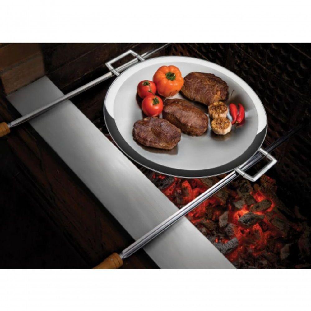 Disco Para Grelhar Tramontina Em Aço Inox Corpo Triplo Cada detalhe da Linha Trix foi elaborado por quem entende tudo de cozinha. O disco para grelhar da Tramontina é composto de uma superfície ampla para cozinhar todos os tipos de carnes ou alimentos.Recomendações de Uso:Antes do uso: remova as eventuais etiquetas e lave-o com água quente, detergente e esponja macia. Outros tipos de produto como palha de aço, poderão riscar ou prejudicar o acabamento da peça.Modo de uso: sempre dissolva o sal em água fervendo ou com os alimentos, mexendo os ingredientes no início do cozimento. As alças de inox aquecem durante o cozimento. Aconselhamos o uso de luvas durante o manuseio. Use sempre utensílios resistentes ao calor. Alguns alimentos que possuem amido, como massa e arroz, poderão deixar manchas na parte interna do disco durante o cozimento. Deixe o disco quente somente em superfícies resistentes ao calor.Após o uso: sempre deixe o produto esfriar antes de mergulhar na água. Se deixar queimar alimentos, deixe o produto de molho em água. Para remover facilmente as manchas, passe um pano umedecido com suco de limão ou vinagre. Evite deixar alimento no disco por muito tempo o sal também pode provocar manchas. Para que o disco de aço inox fique sempre bonito e com brilho, recomendamos que seja lavado somente com detergente e esponja. Depois da lavagem, sempre que possível, enxágue o disco com água quente e seque-o imediatamente, para que ele mantenha o brilho original, pois o cloro e as substâncias contidas na água podem deixar manchas no disco. Não guarde a peça em locais úmidos. A umidade também provoca manchas. Para manter o brilho, a Tramontina desenvolveu uma pasta especial para polir e remover manchas nos produtos de aço inox, que está disponível nos principais pontos de venda (94537000).- Foto meramente ilustrativa.Informações Adicionais:- Totalmente feito de aço inox, por isso não solta nenhum resíduo nos alimentos, mantendo-os saudáveis.- Altamente durável, mantém suas características originais, preservando a beleza, a higiene e a durabilidade do material.- Disco com corpo triplo (aço inox + alumínio + aço inox) distribui o calor uniformemente, proporcionando um cozimento mais rápido e uniforme, economizando energia e deixando os alimentos aquecidos por mais tempo.- Possui uma leve inclinação, sendo o centro mais fundo que a borda.- Podendo ser utilizado diretamente sobre a chama do fogão a lenha, a gás, elétrico ou de indução, sendo muito prático em churrasqueiras e fornos.- Ideal para preparar carnes, peixes, risotos, entre outros pratos.- resiste à máquina de lavar louça.